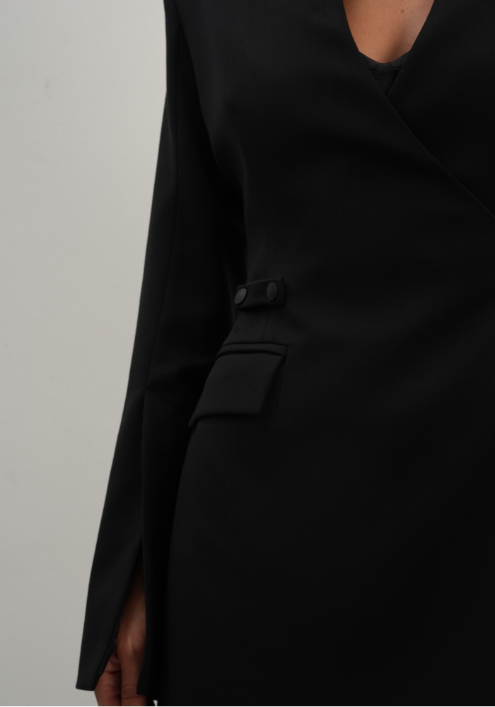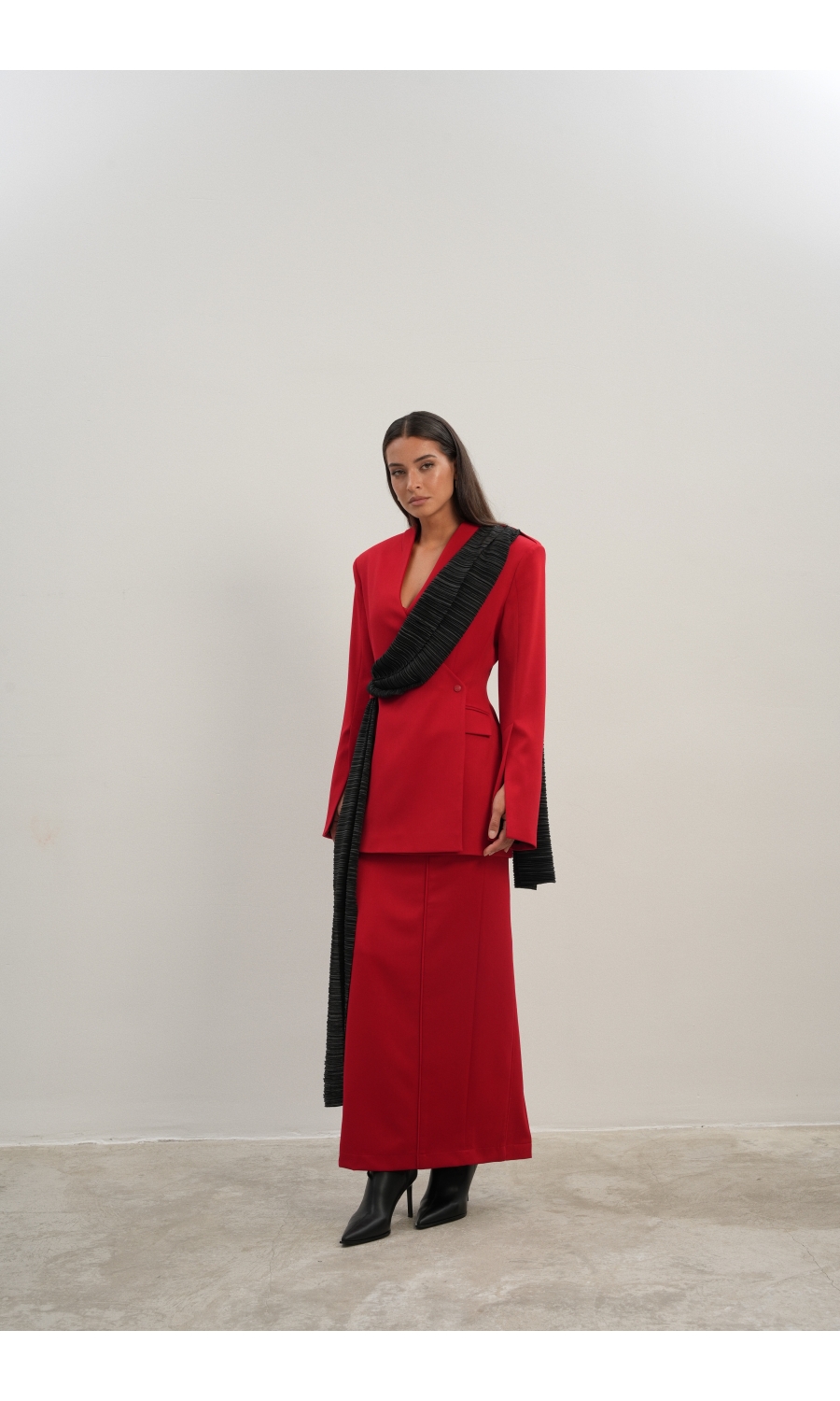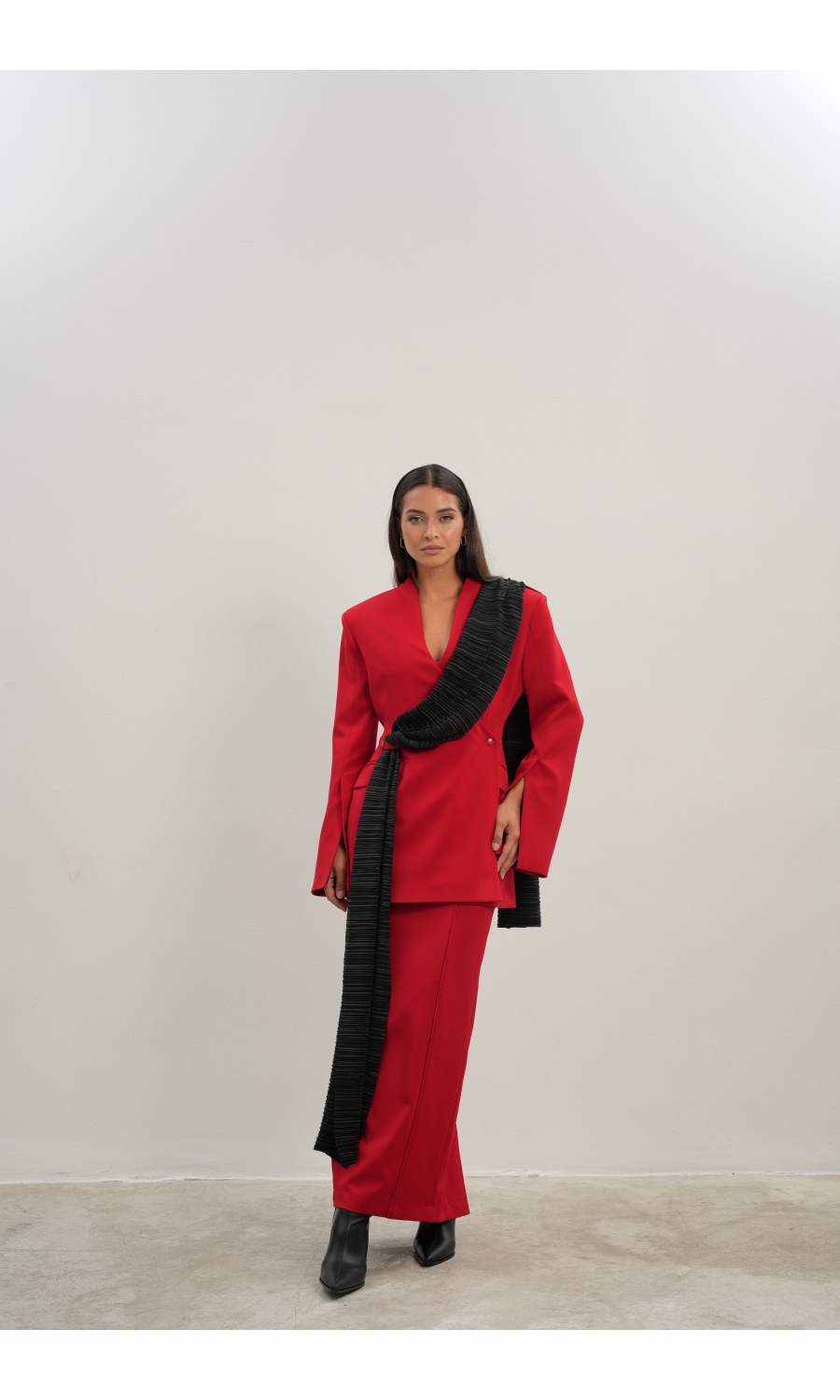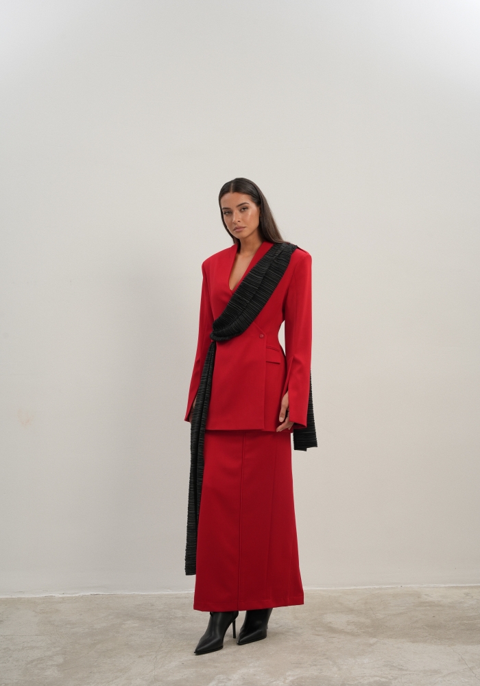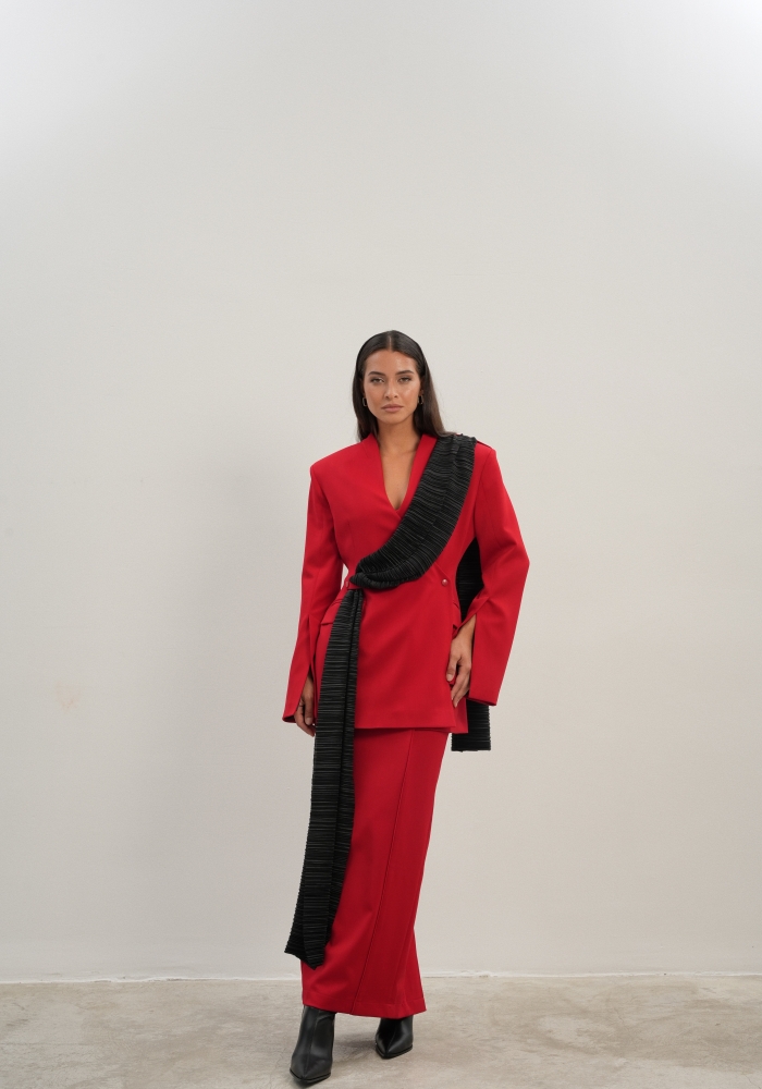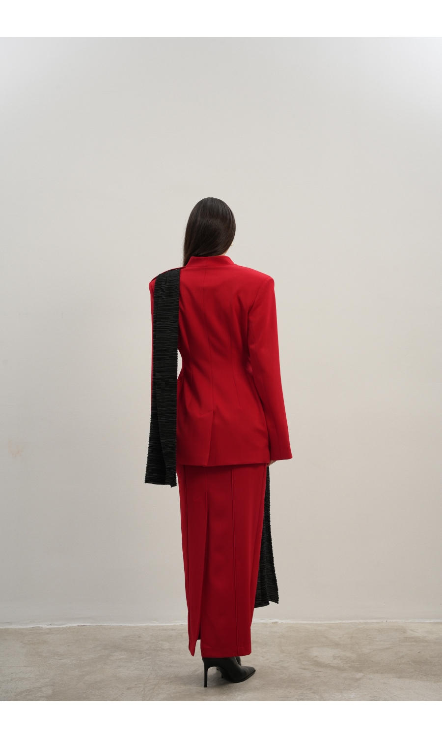 | Жакет приталенного кроя выполнен из поливискозной ткани. Имеет акцентные плечи и выраженную талию, тем самым создает силуэт песочных часов. На жакете расположены кнопки, которыми можно регулировать объем талии. В комплекте идет съемная декоративная деталь в виде ткани гофре, которая крепится на хлястик в районе плечевого шва и талии. Дополните образ брюками палаццо |