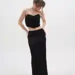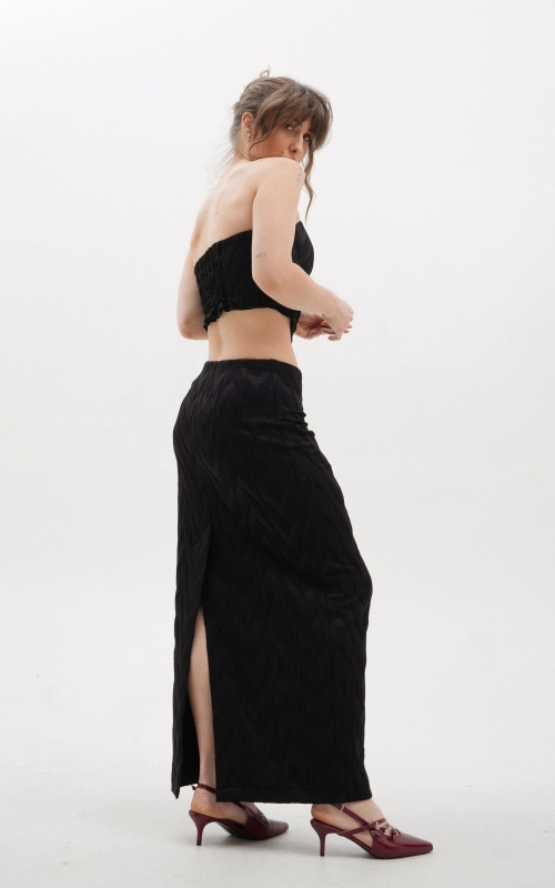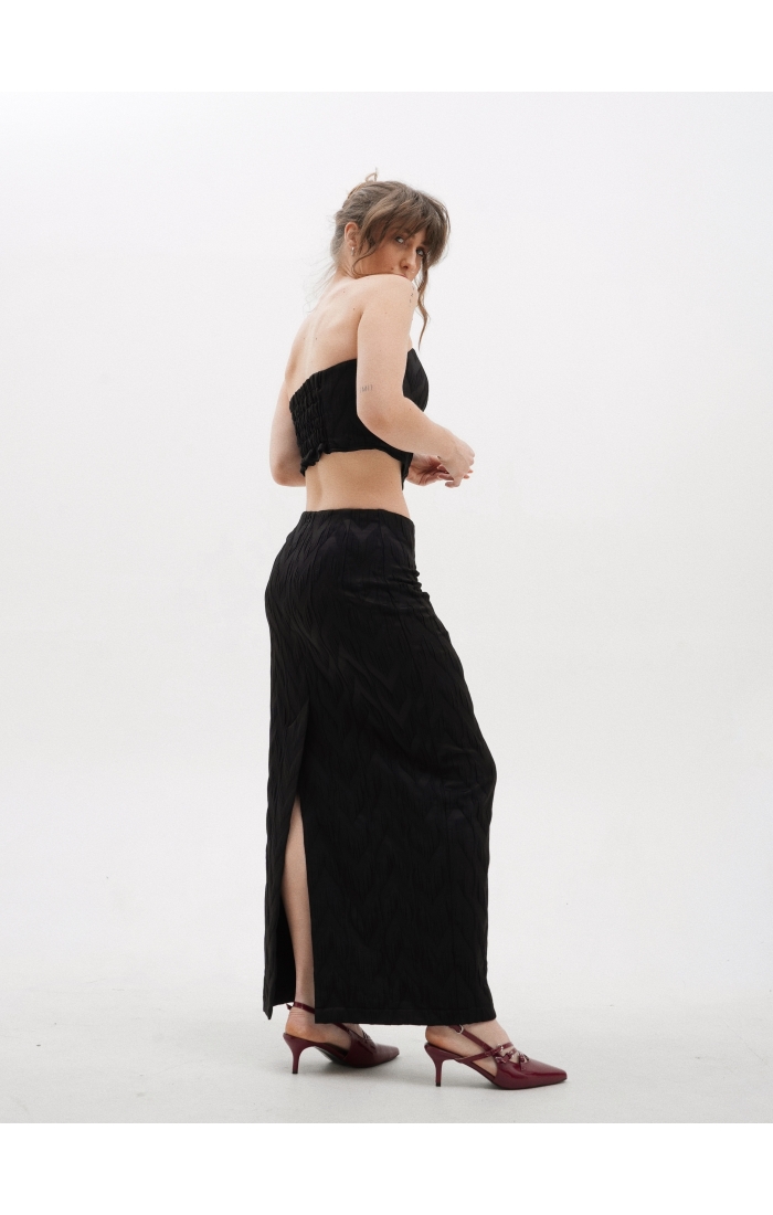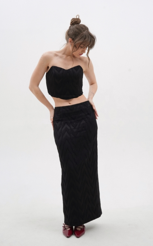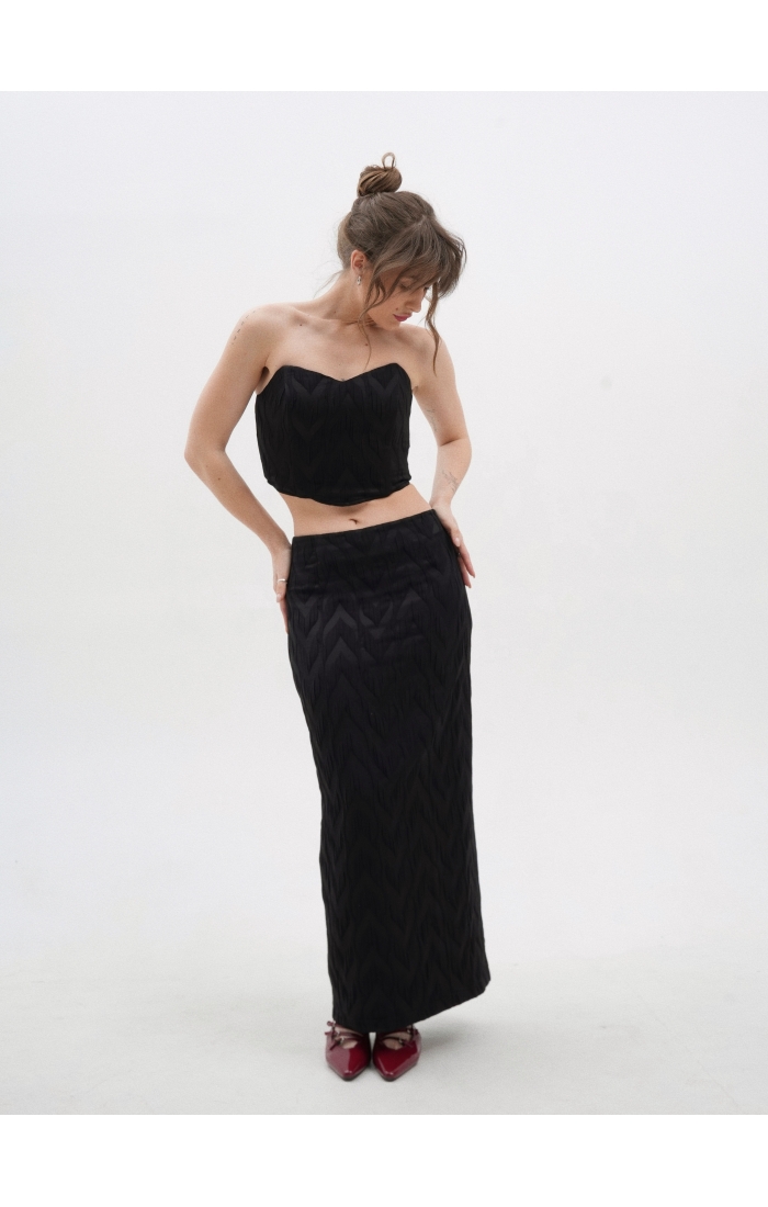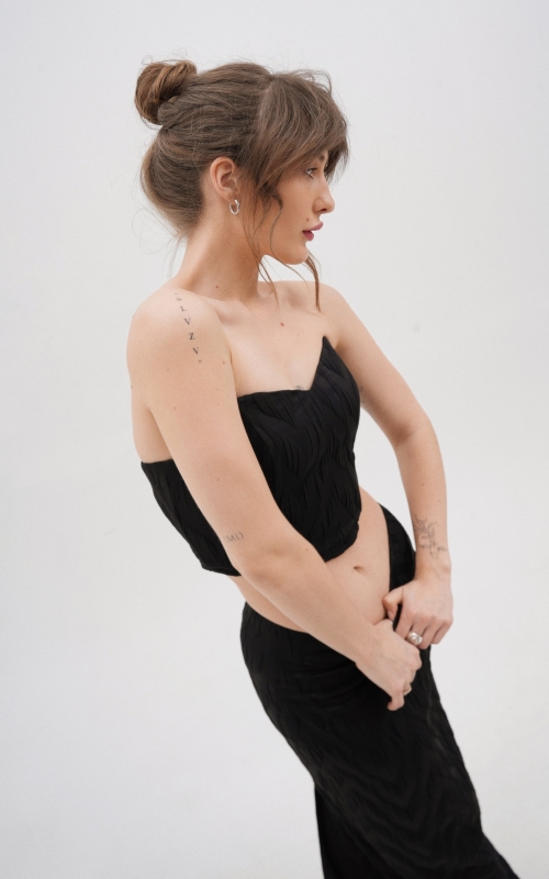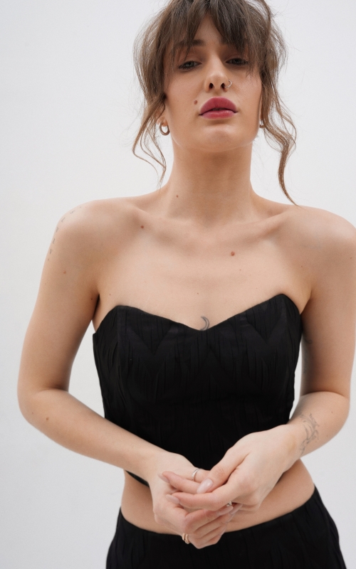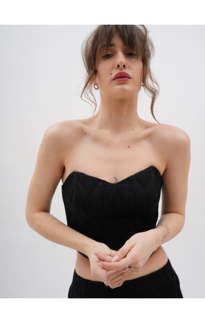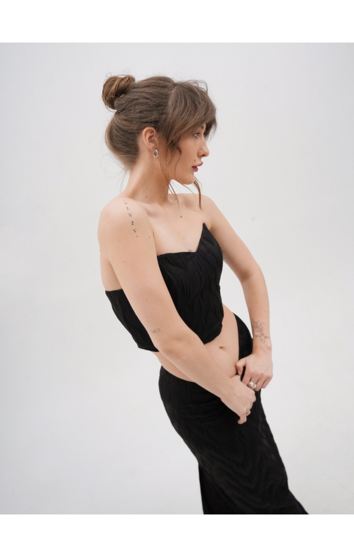 Корсет выполнен из поливискозной фактурной ткани. Благодаря внутренним косточкам и резинкой сзади комфортен в носке без бюстгальтера. Дополните образ юбкой макси или шортами из коллекции Enigma.