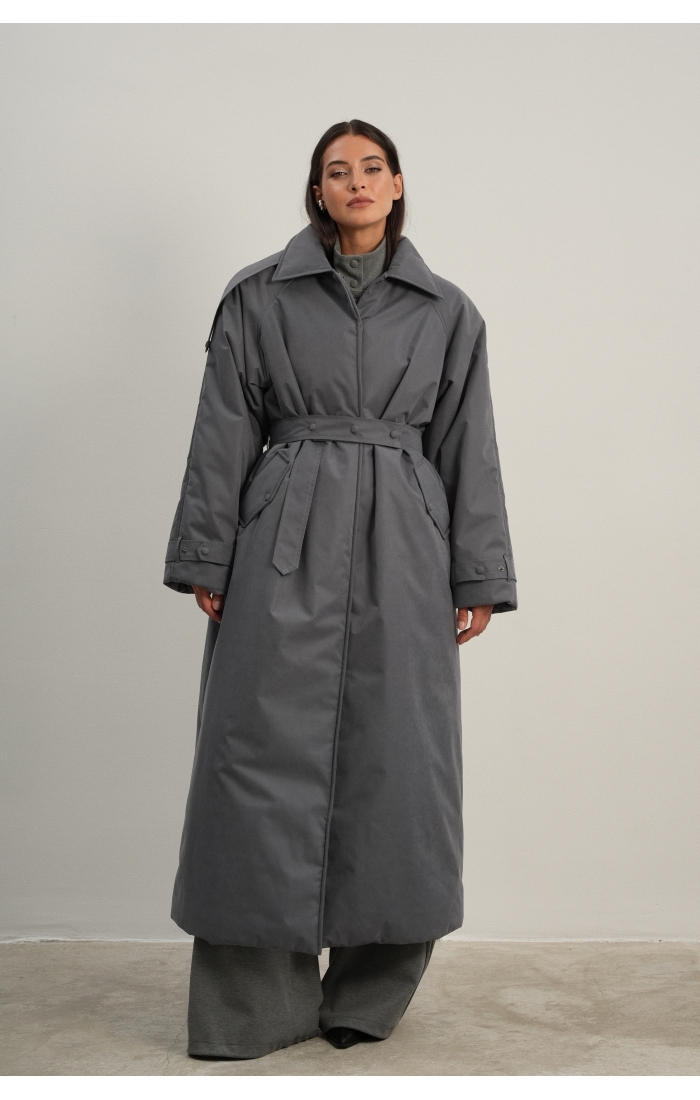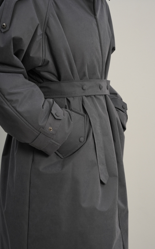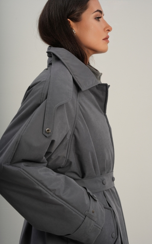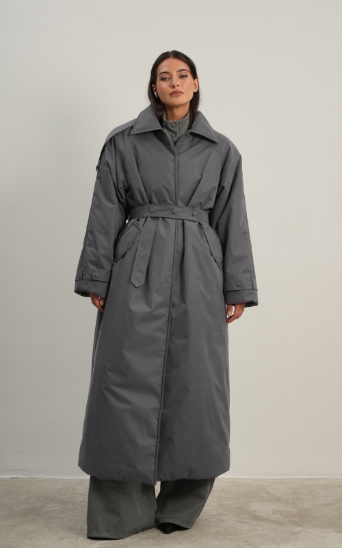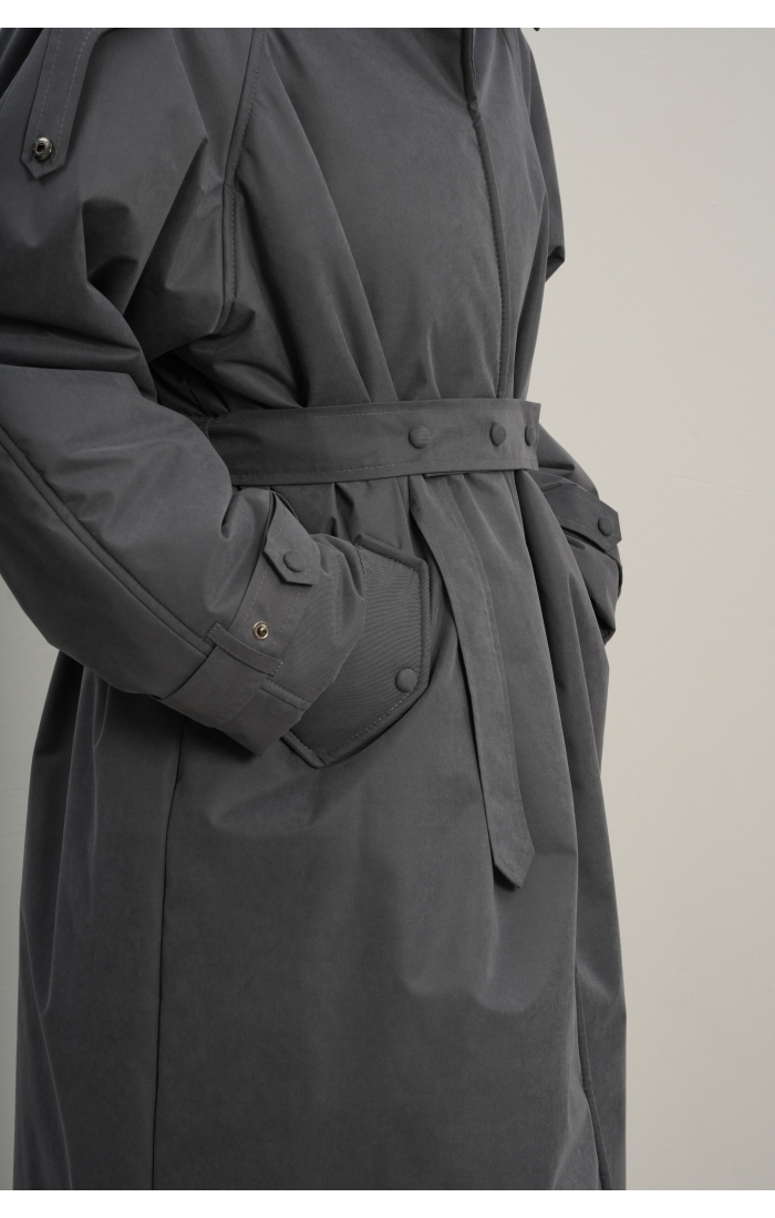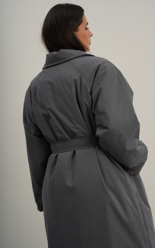 Утеплённая куртка прямого кроя в длине макси со съемной пелериной выполнена из современного ветронепродуваемого материала с водоотталкивающей пропиткой. Ткань имеет легкую фактуру в виде мелких полосок и слегка бархатистую на ощупь поверхность. Застежка в виде кнопок под обтяжку. Пояс застегивается также на кнопки. Паты по низу рукава служат для регулировки. Температурный режим до -15.