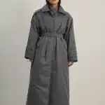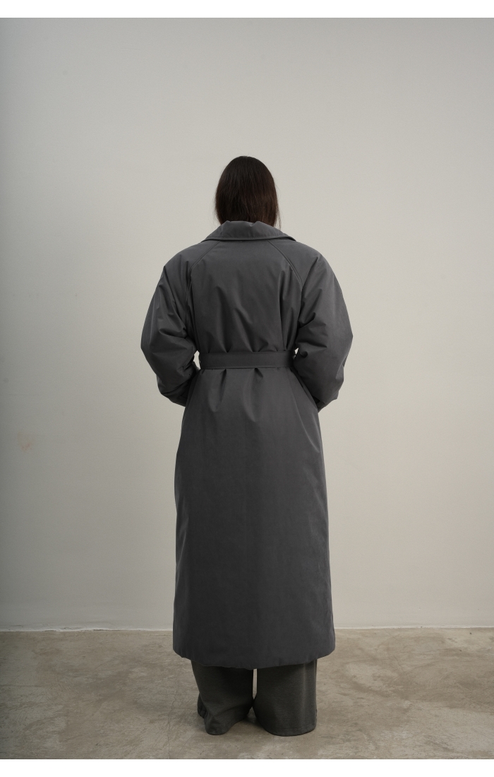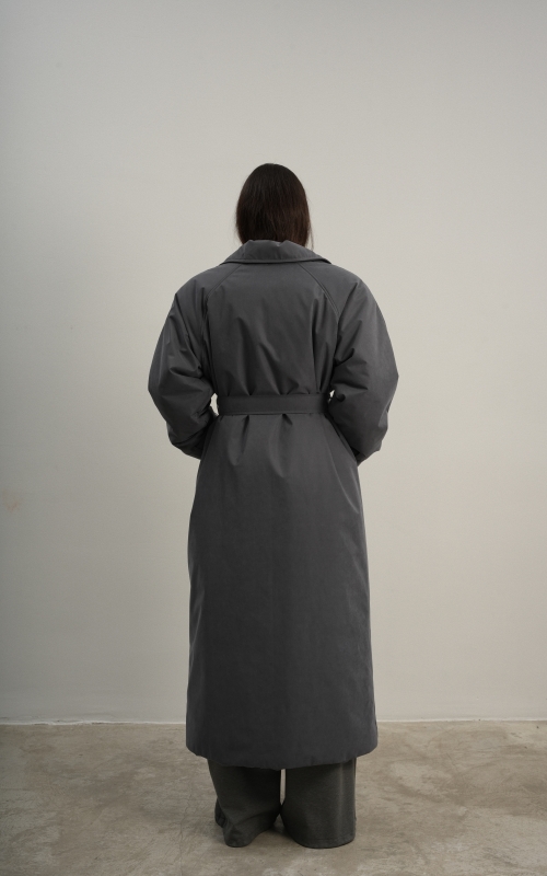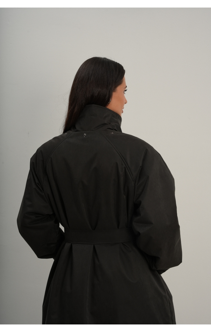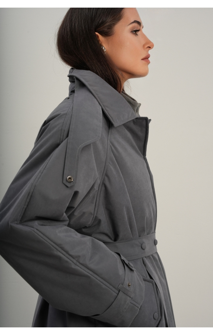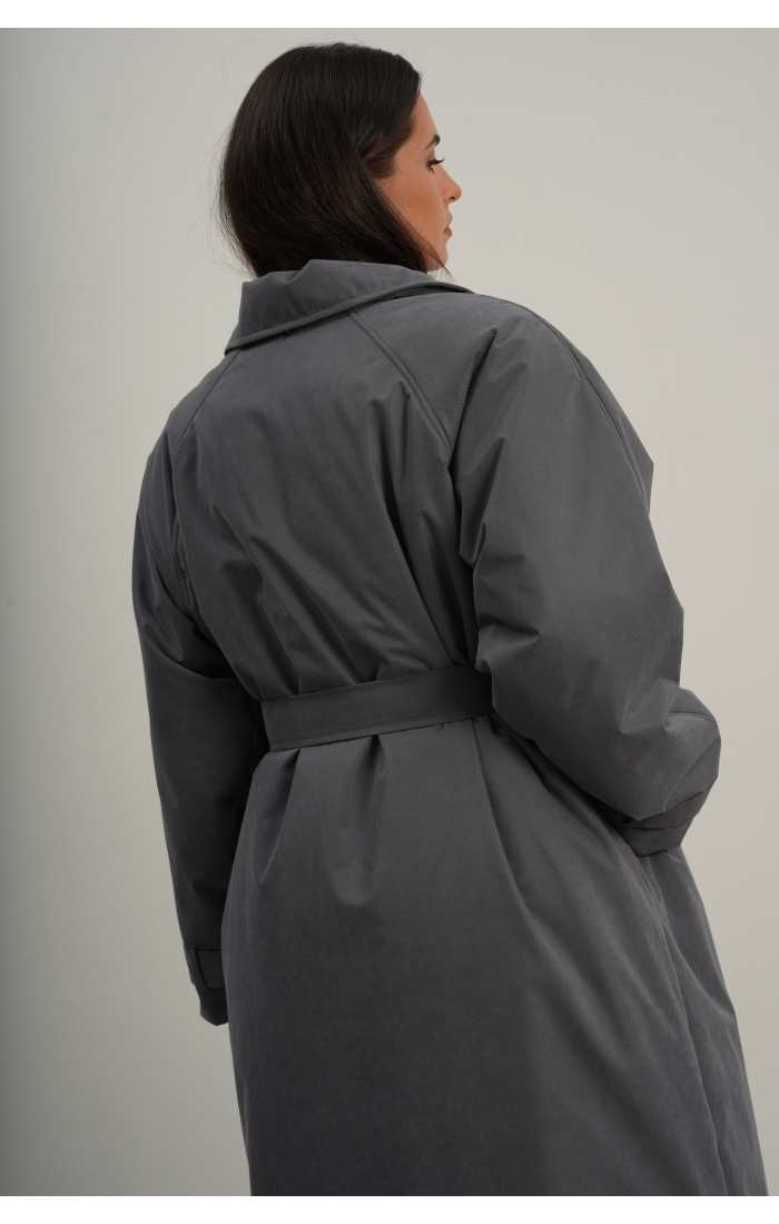 Утеплённая куртка прямого кроя в длине макси со съемной пелериной выполнена из современного ветронепродуваемого материала с водоотталкивающей пропиткой. Ткань имеет легкую фактуру в виде мелких полосок и слегка бархатистую на ощупь поверхность. Застежка в виде кнопок под обтяжку. Пояс застегивается также на кнопки. Паты по низу рукава служат для регулировки. Температурный режим до -15.