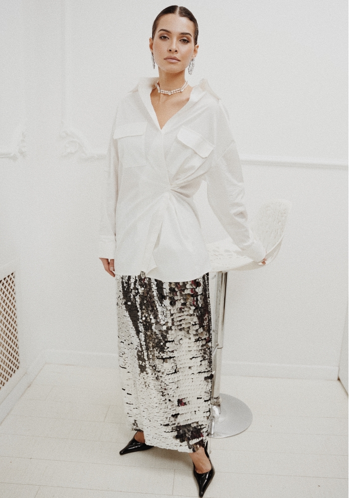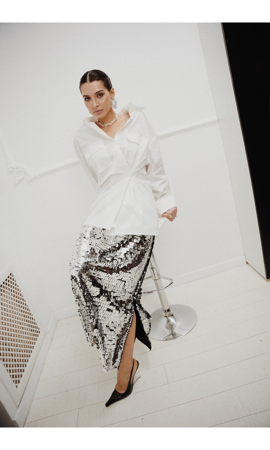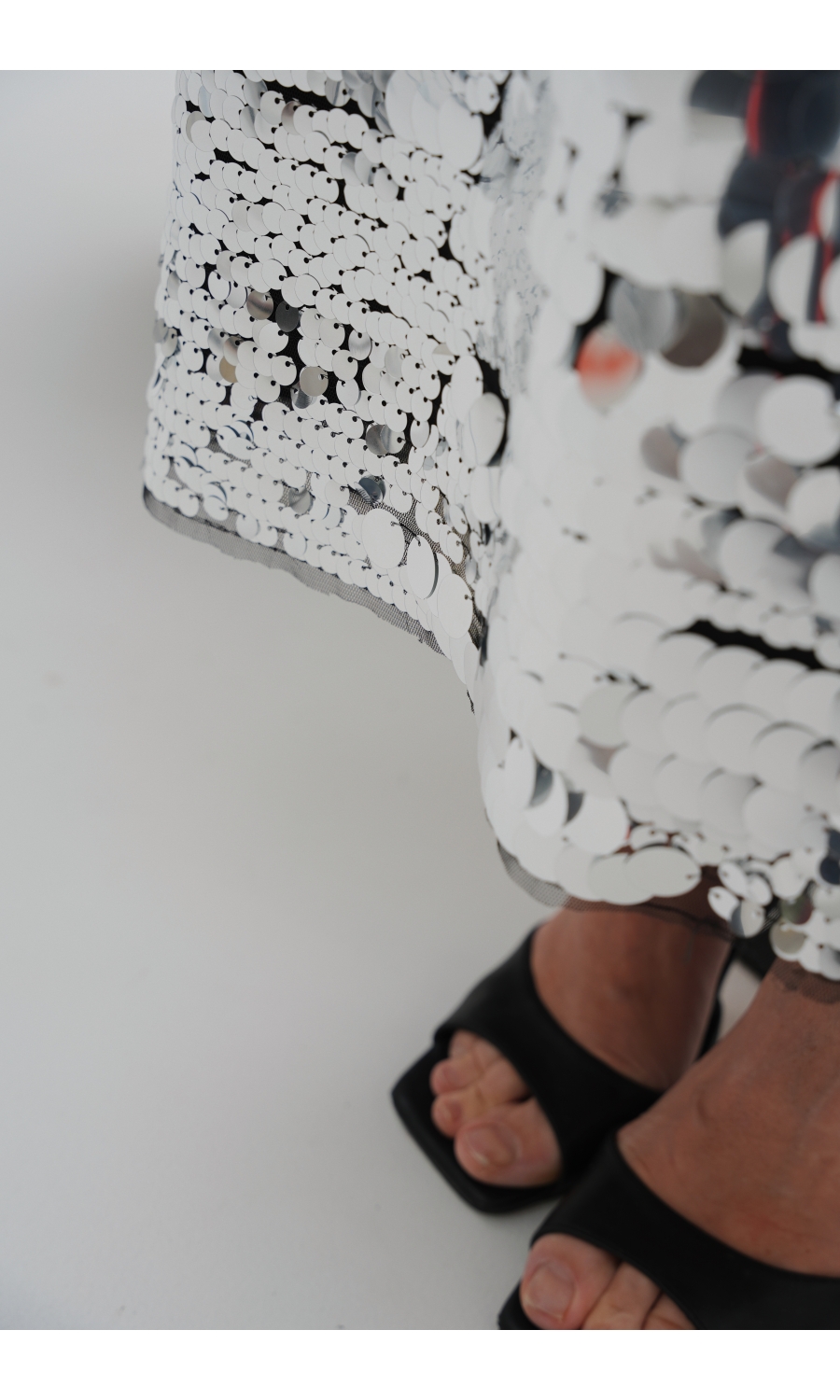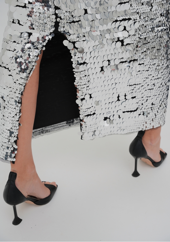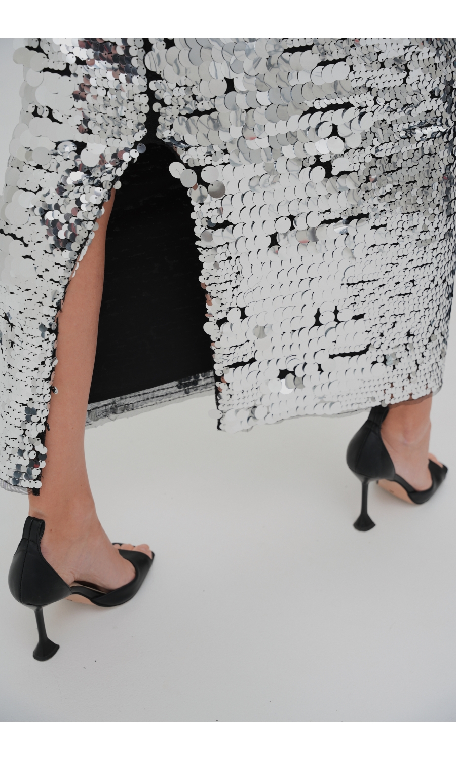 Прямая юбка на резинке из круглых серебряных пайеток. Длина миди, по боковому шву разрез.
