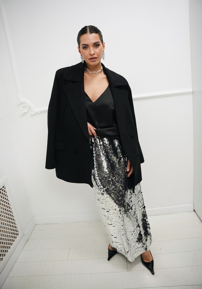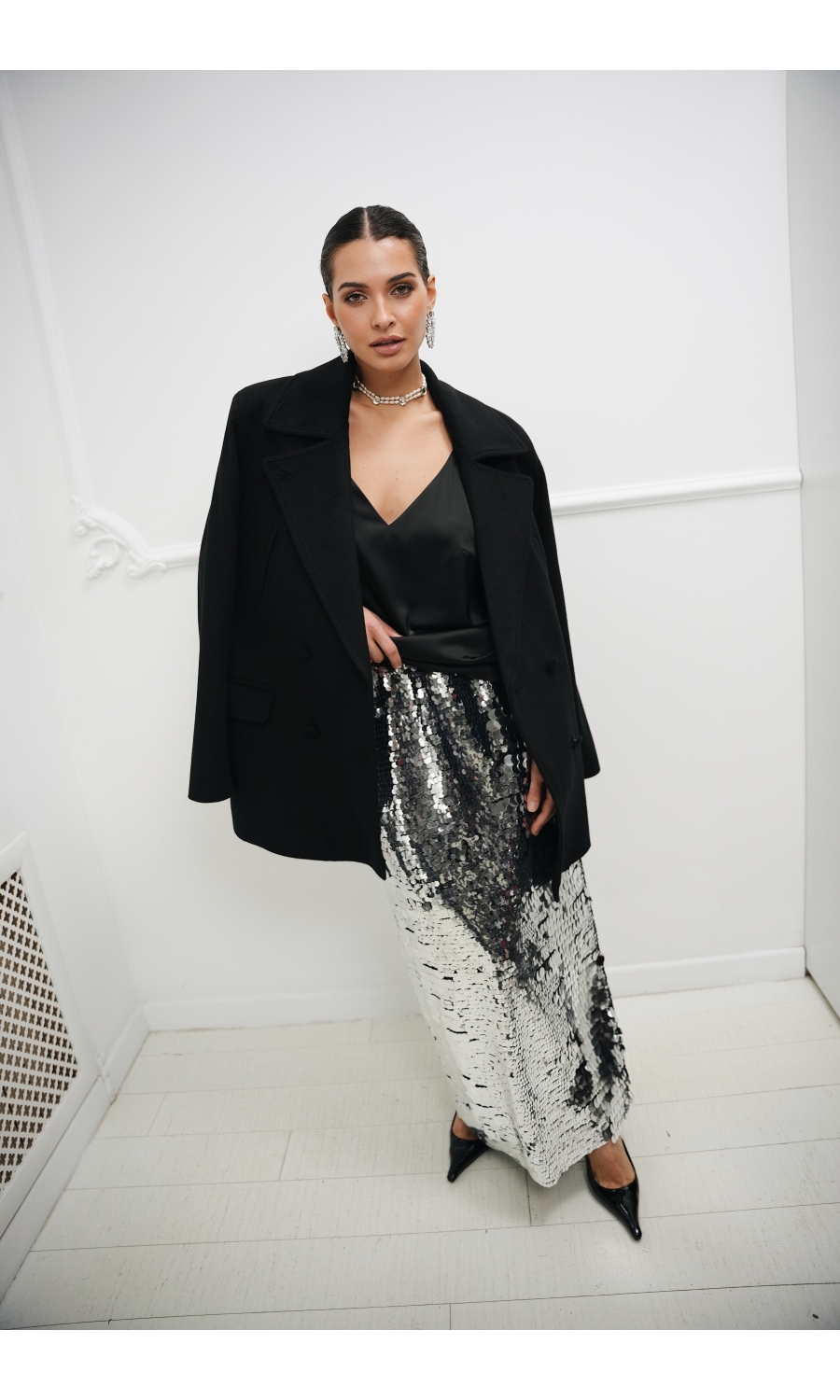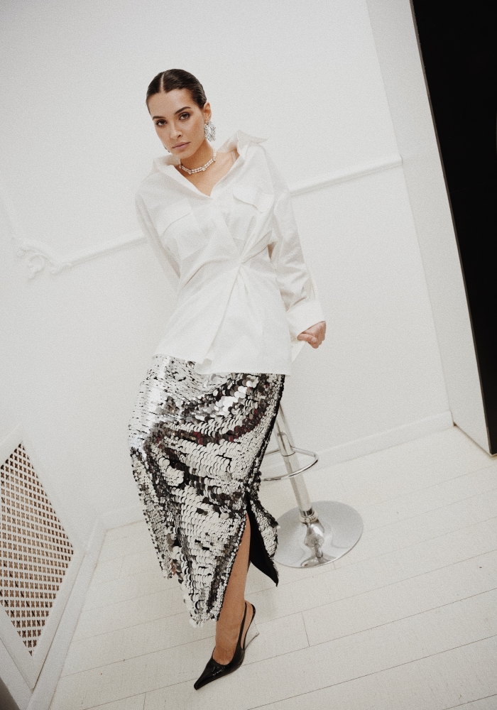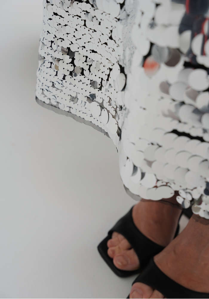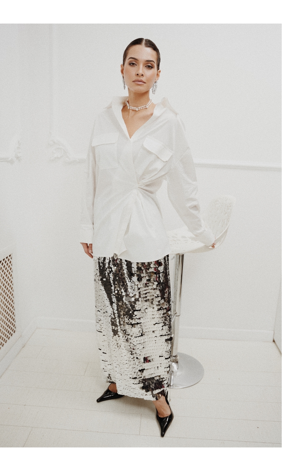 Прямая юбка на резинке из круглых серебряных пайеток. Длина миди, по боковому шву разрез.