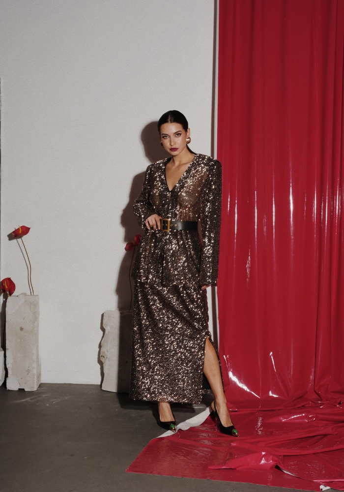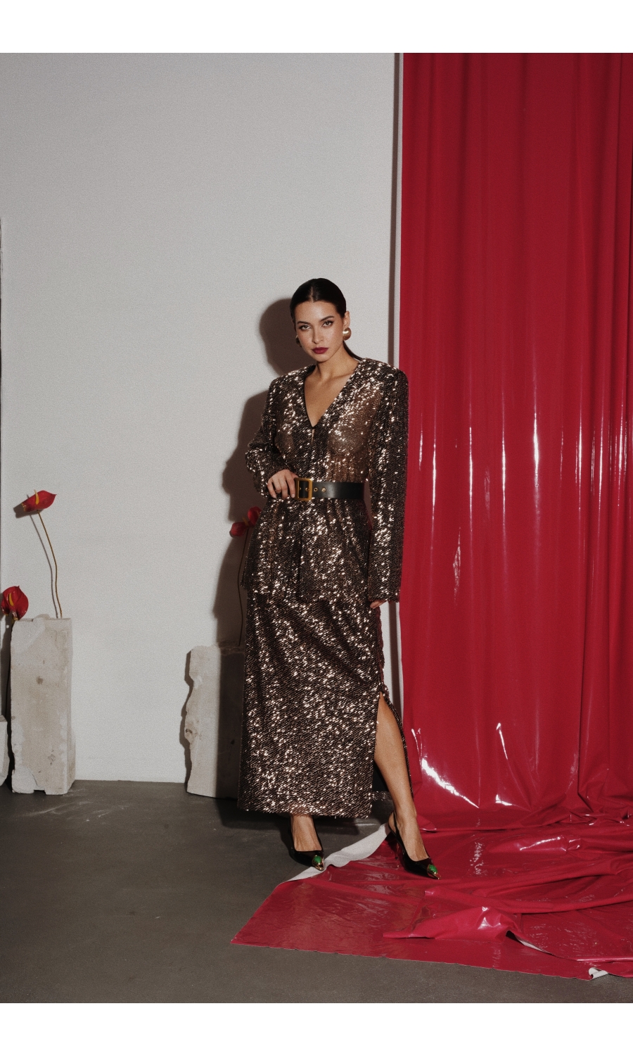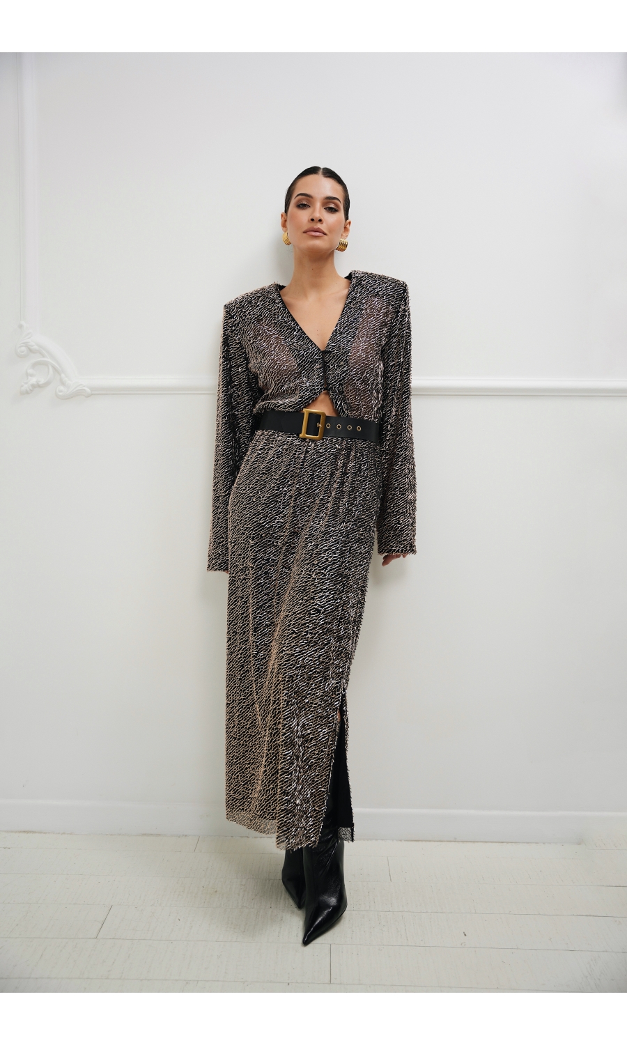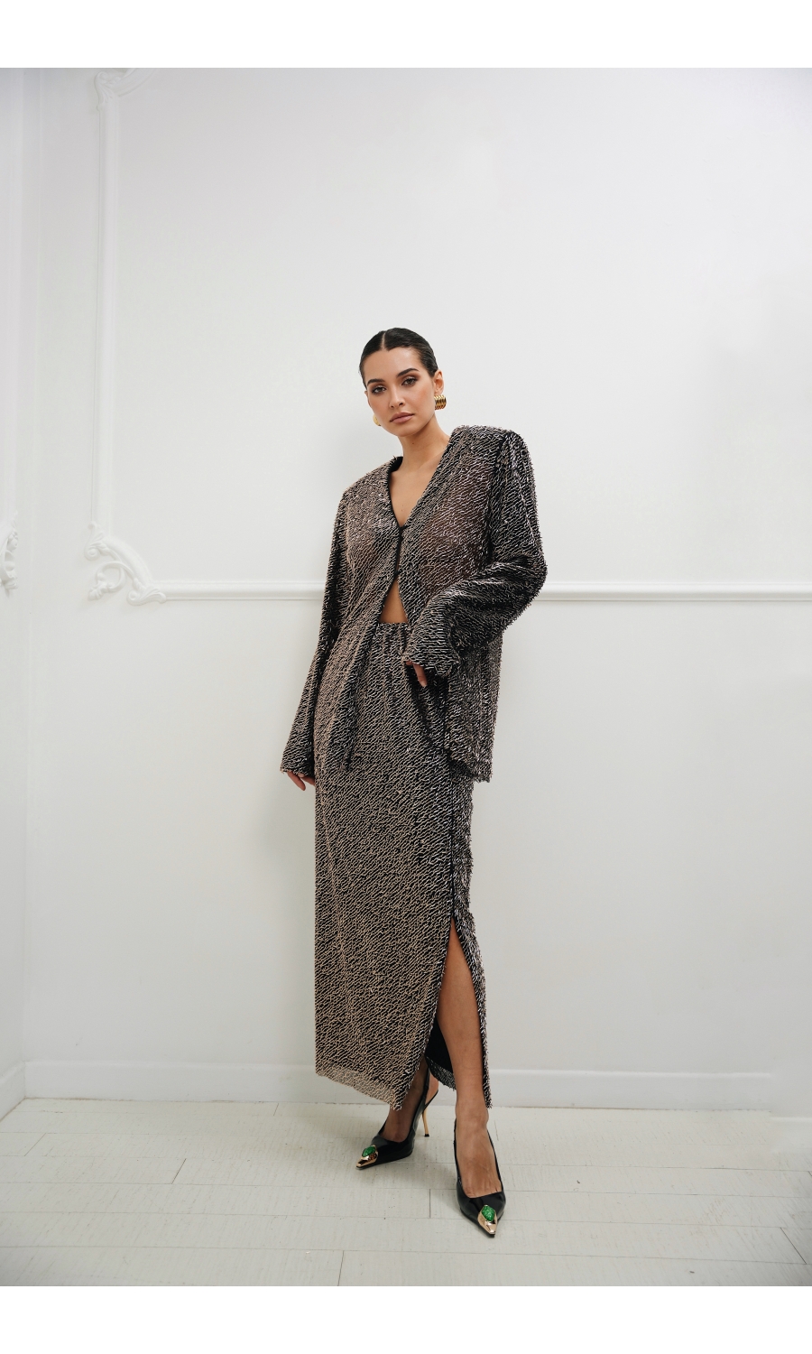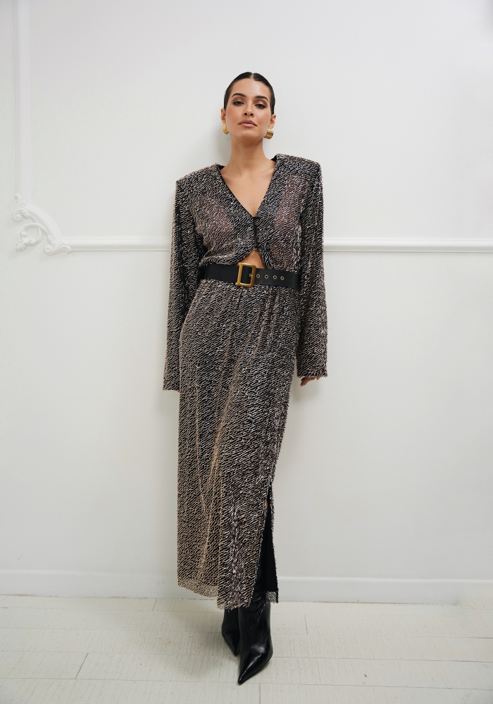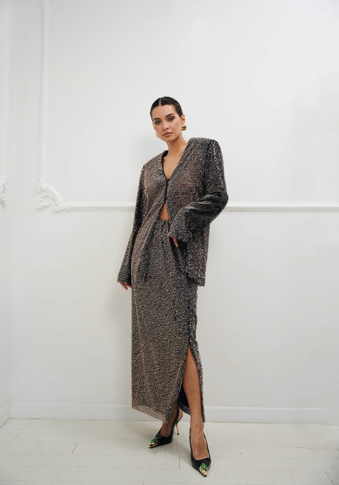 Прямая юбка на резинке из скрученных золотых пайеток. Длина миди, по боковому шву разрез. Дополните образ жакетом DIVA.