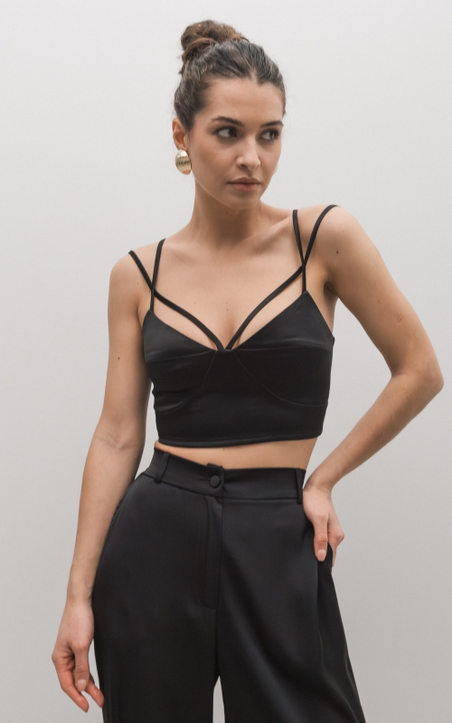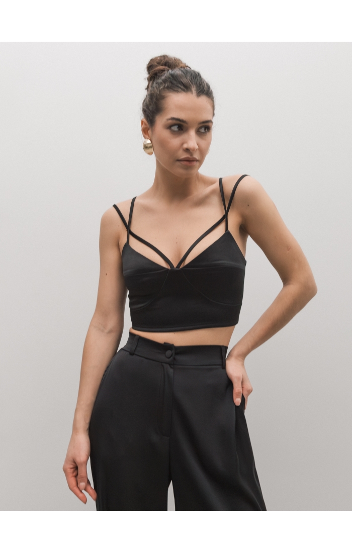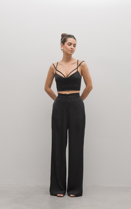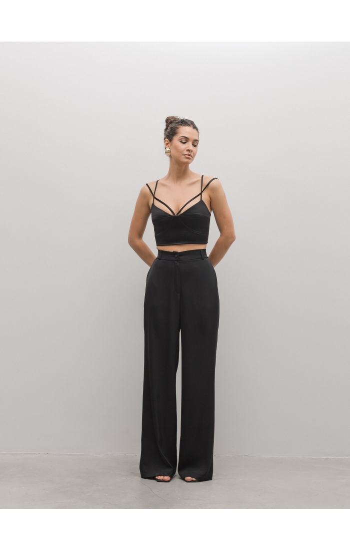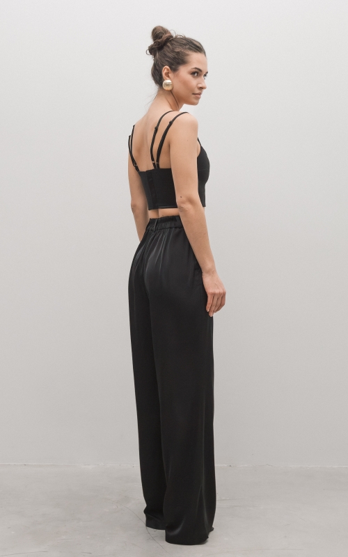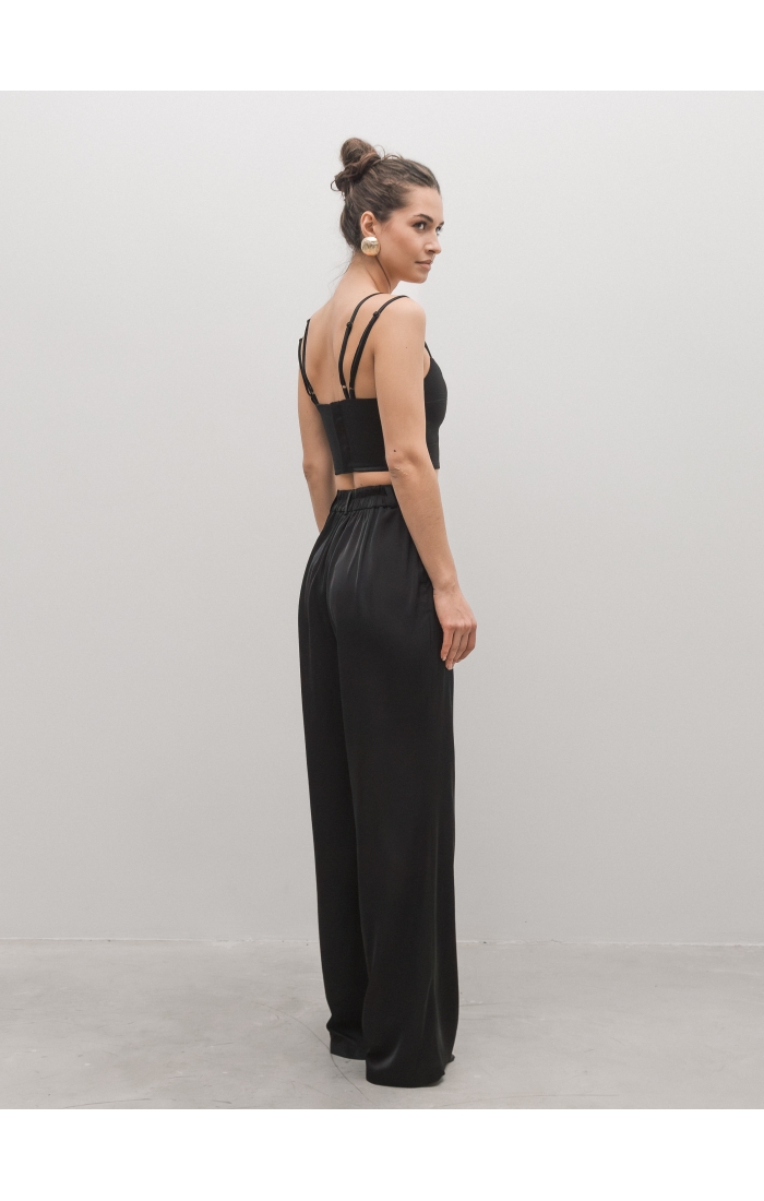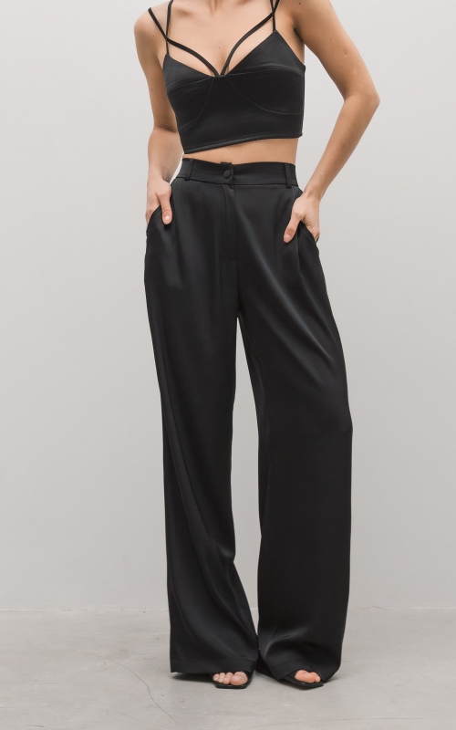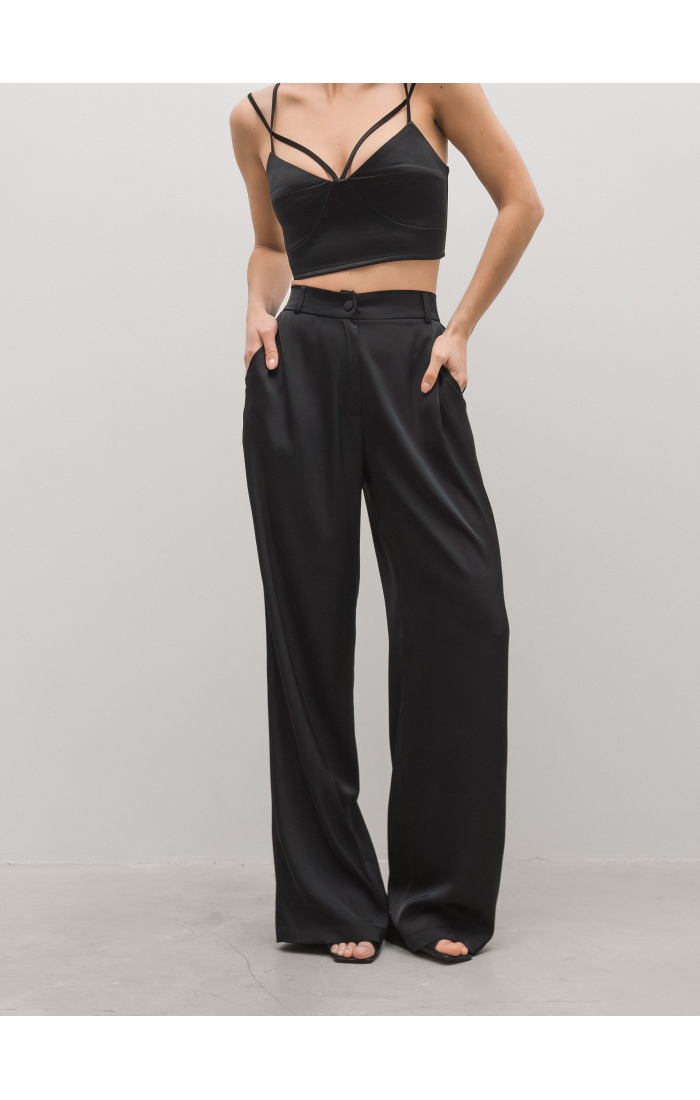 Брюки прямого кроя выполнены из искусственного шелка. В боковых швах расположены карманы.