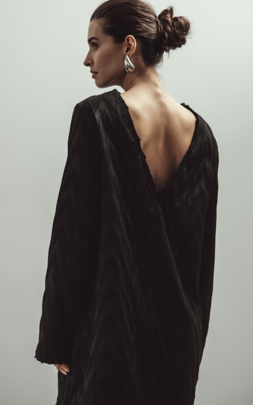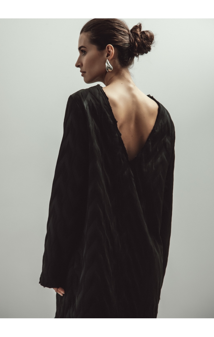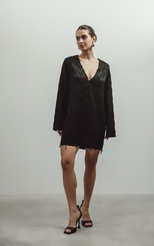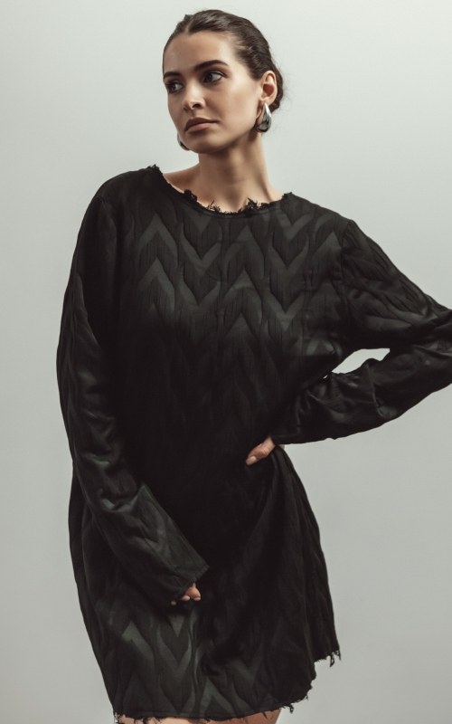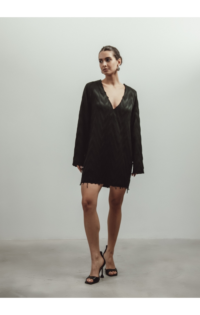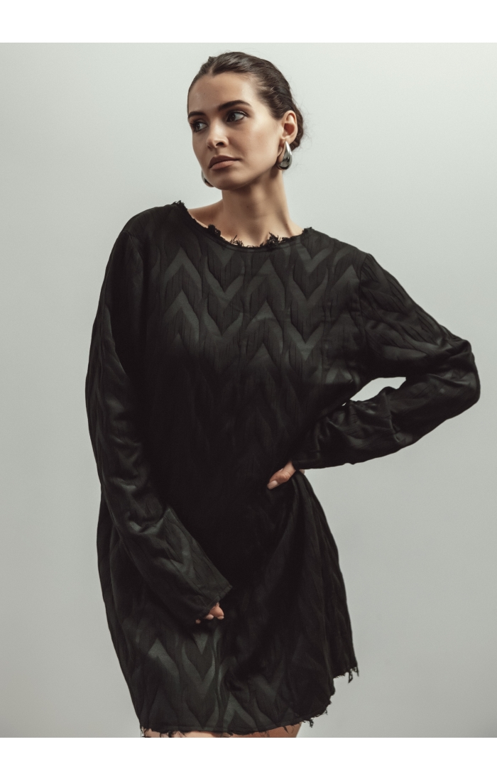 Платье мини прямого кроя выполнено из фактурной поливискозной ткани. Отличительными деталями являются необработанные края у платья, что добавляет изделию эффектности. V-образный вырез можно надевать как вперед, так и на спинку.