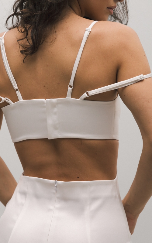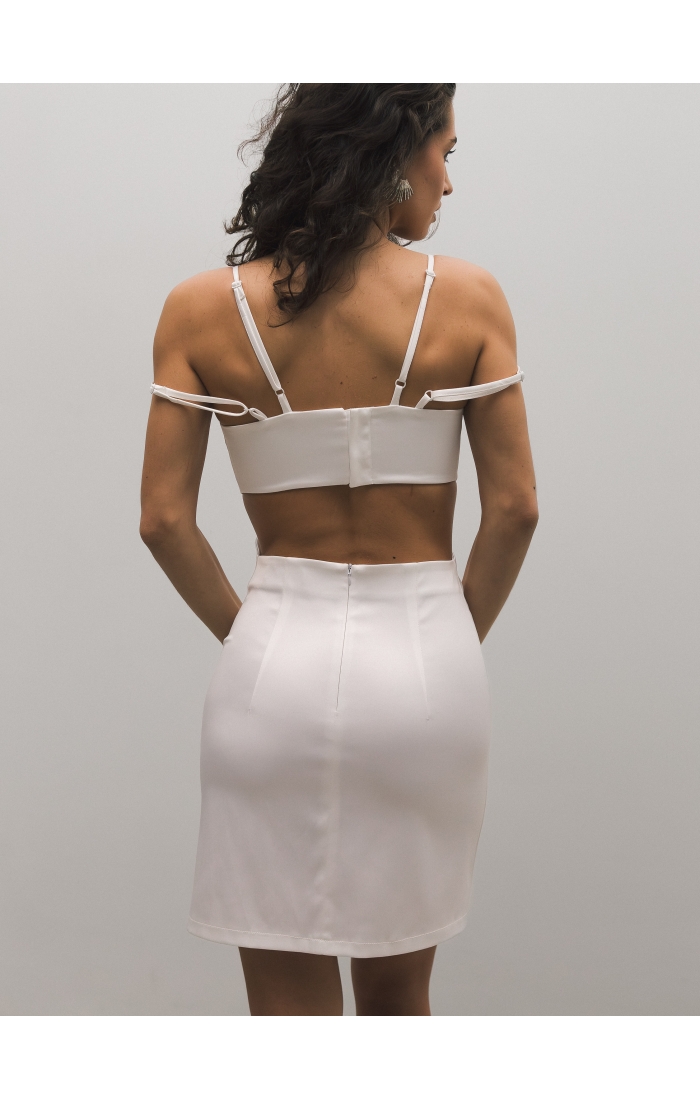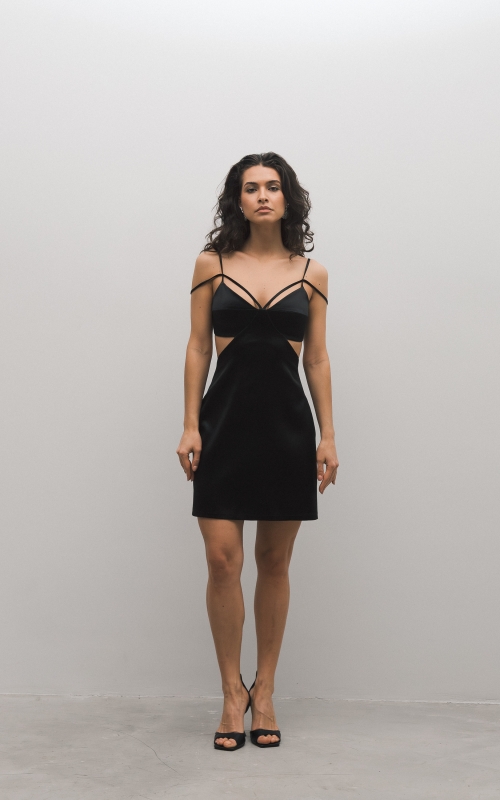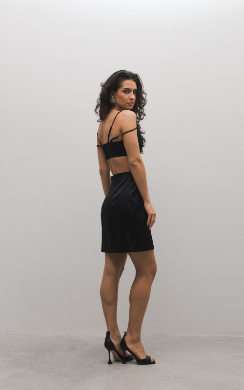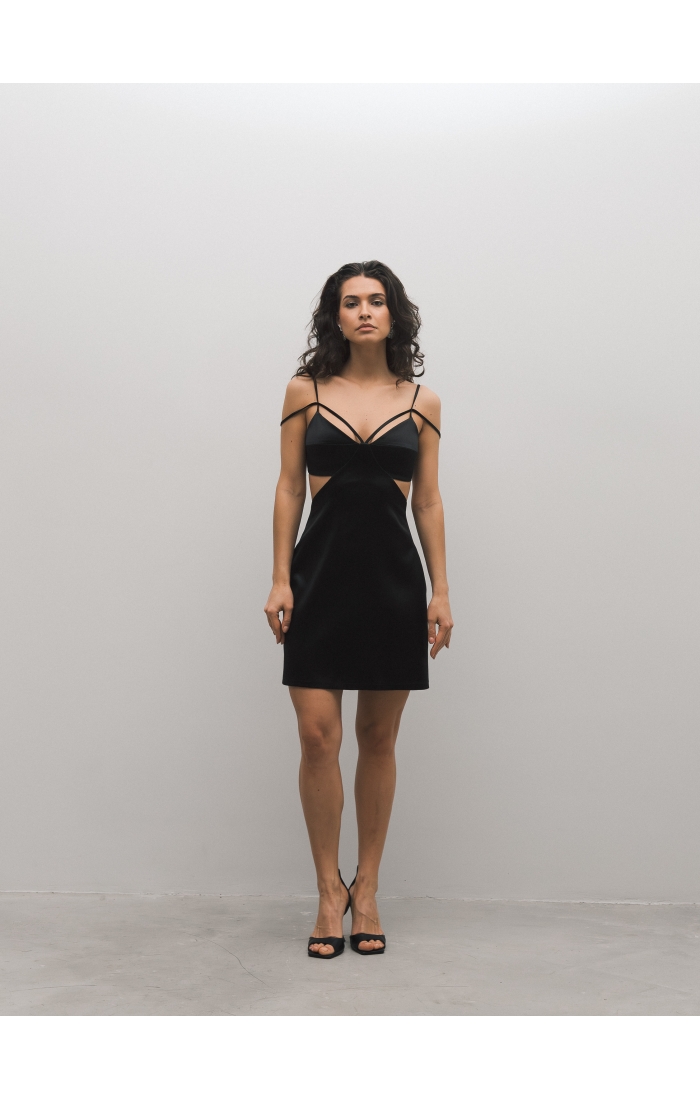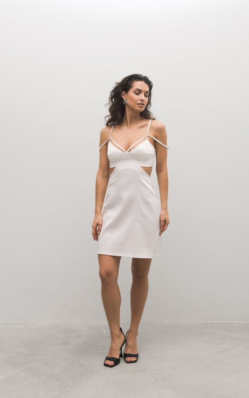 Платье комбинация в длине мини, выполнена из атласа. Вырезы на талии, двойные регулируемые бретели делают платье интереснее. Сзади лиф платья застегивается на крючки.