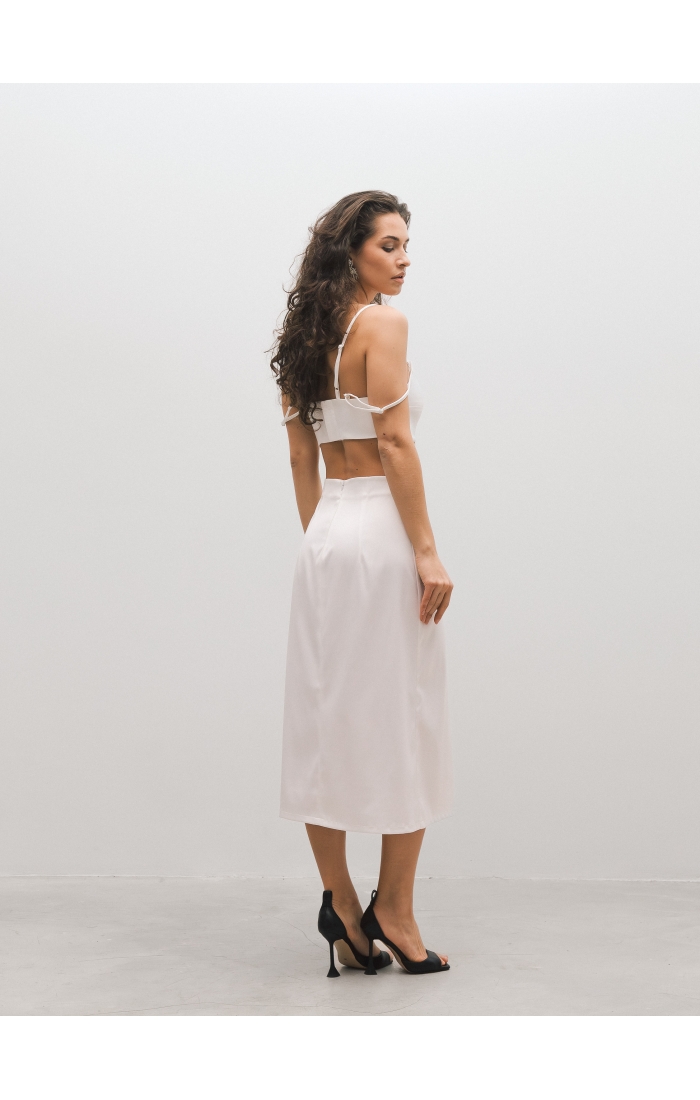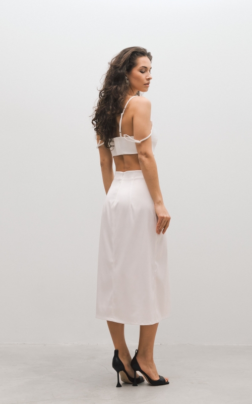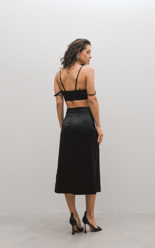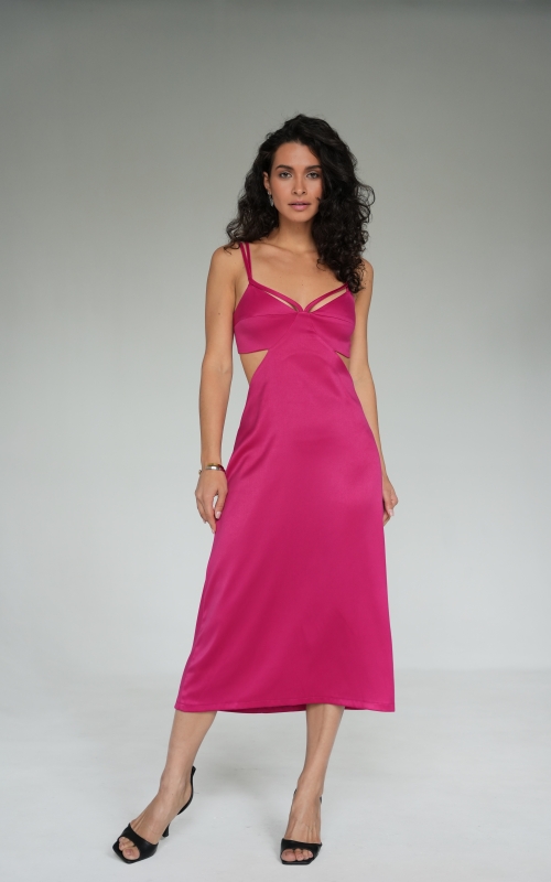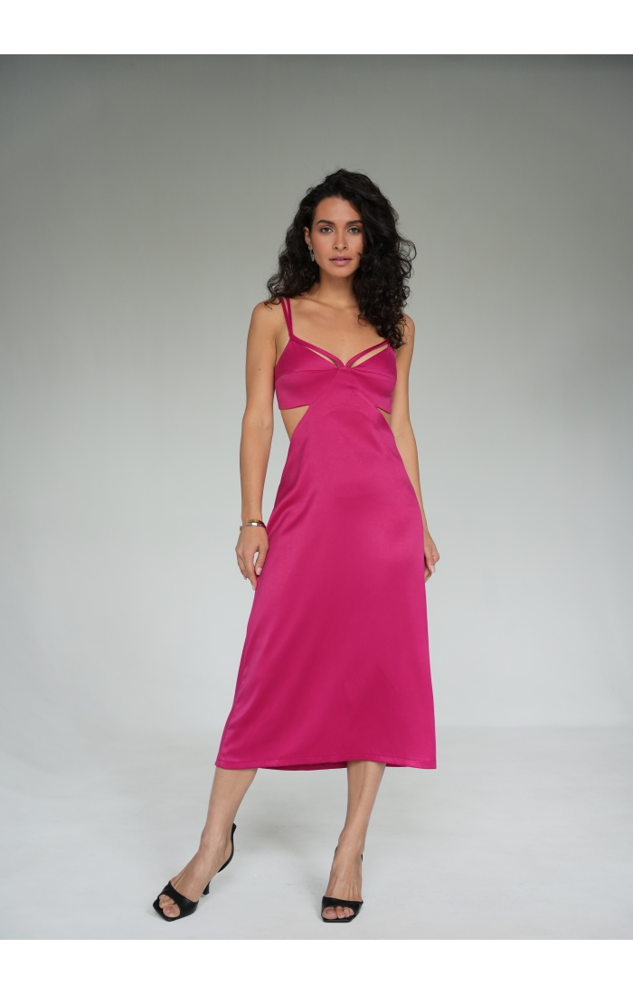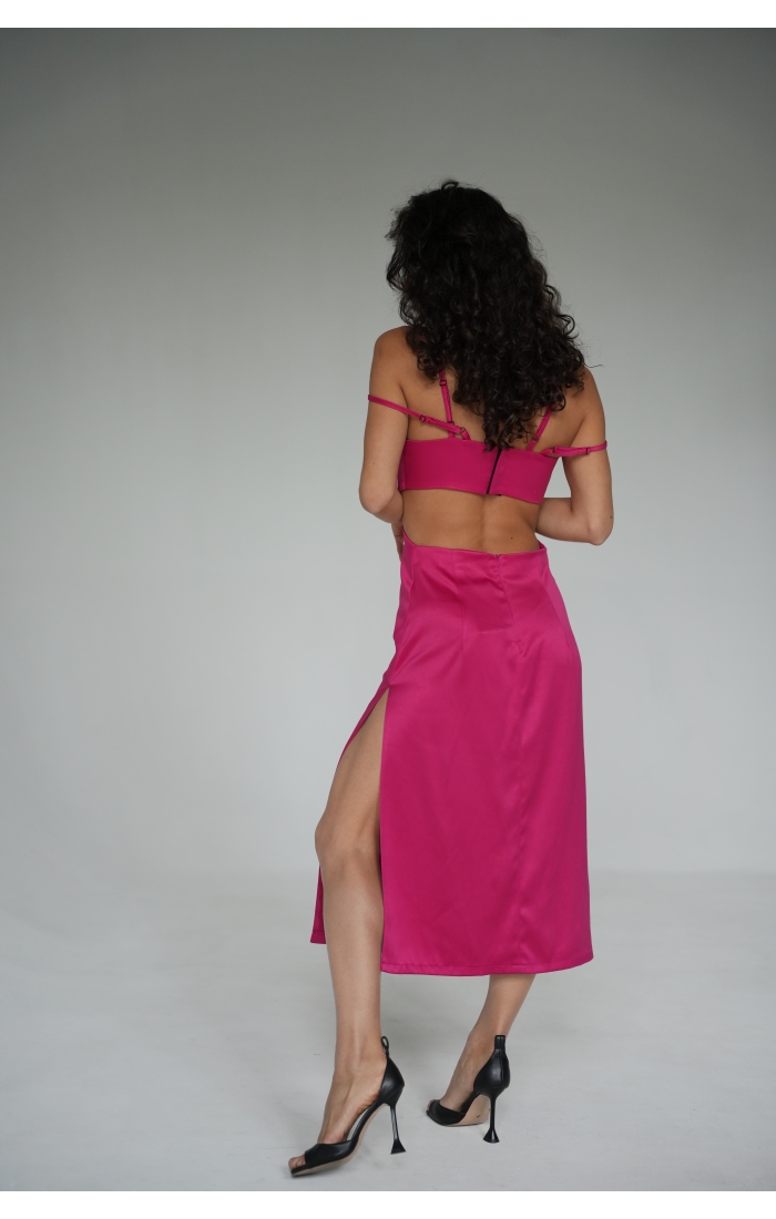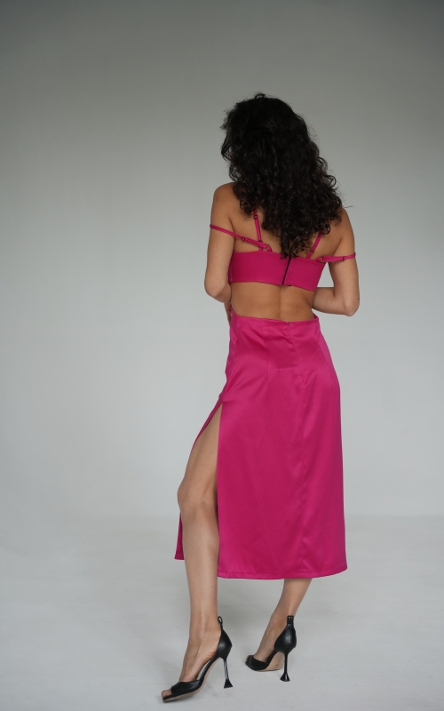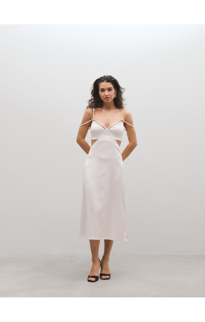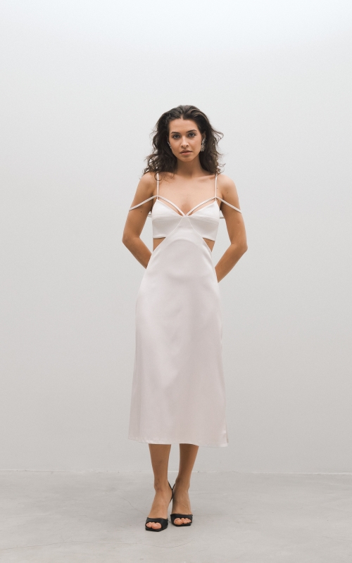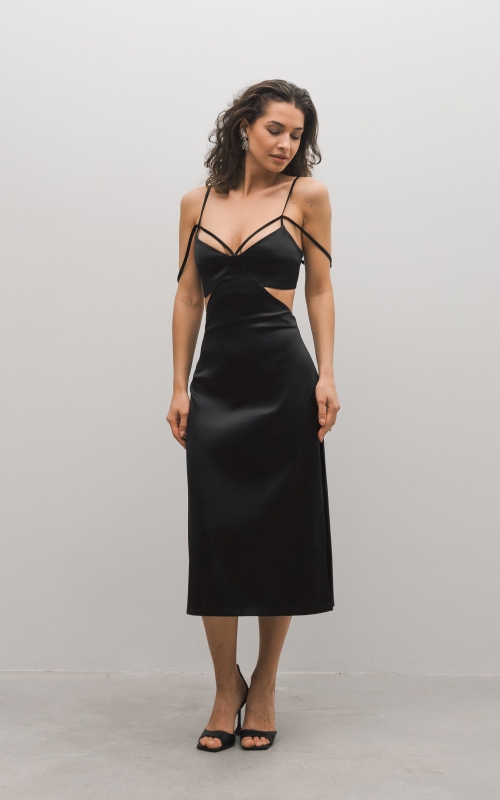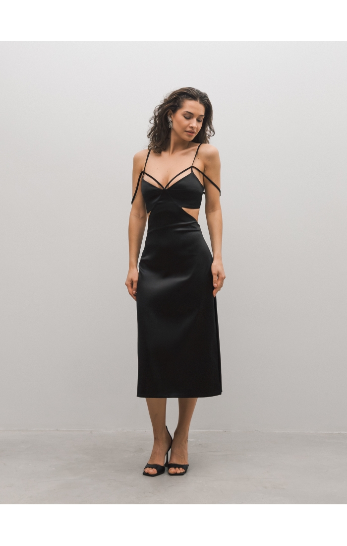 Платье комбинация в длине миди, выполнена из атласа. Вырезы на талии и высокий разрез по боковому шву делают платье интересным. Бретели двойные и регулируемые, сзади лиф платья застегивается на крючки.
