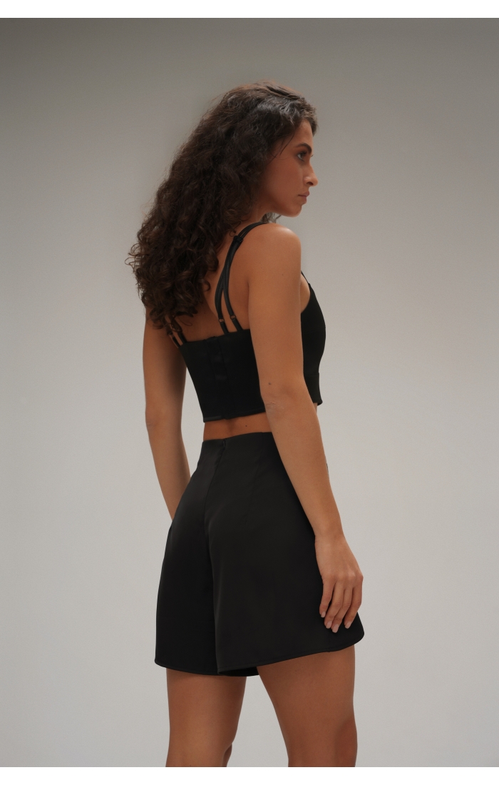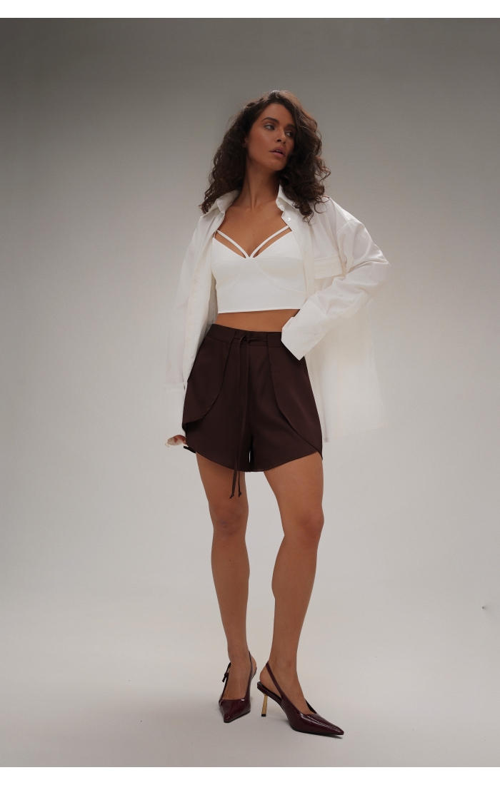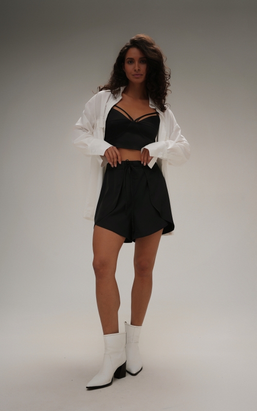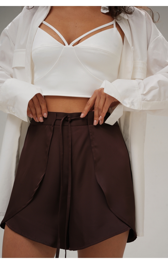 Шелковые шорты на запах, выполнены из поливискозной ткани. Дополните образ шелковой рубашкой.