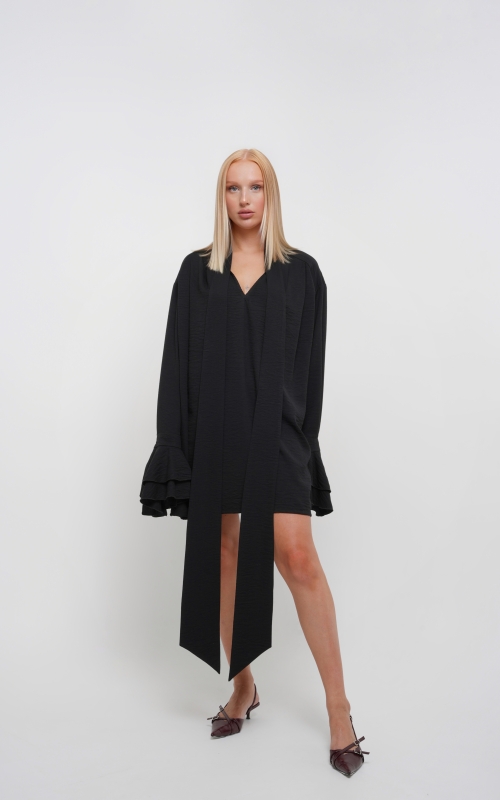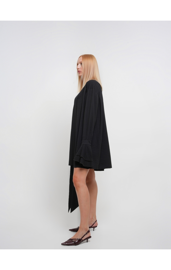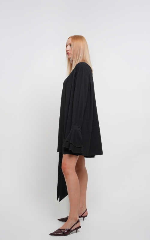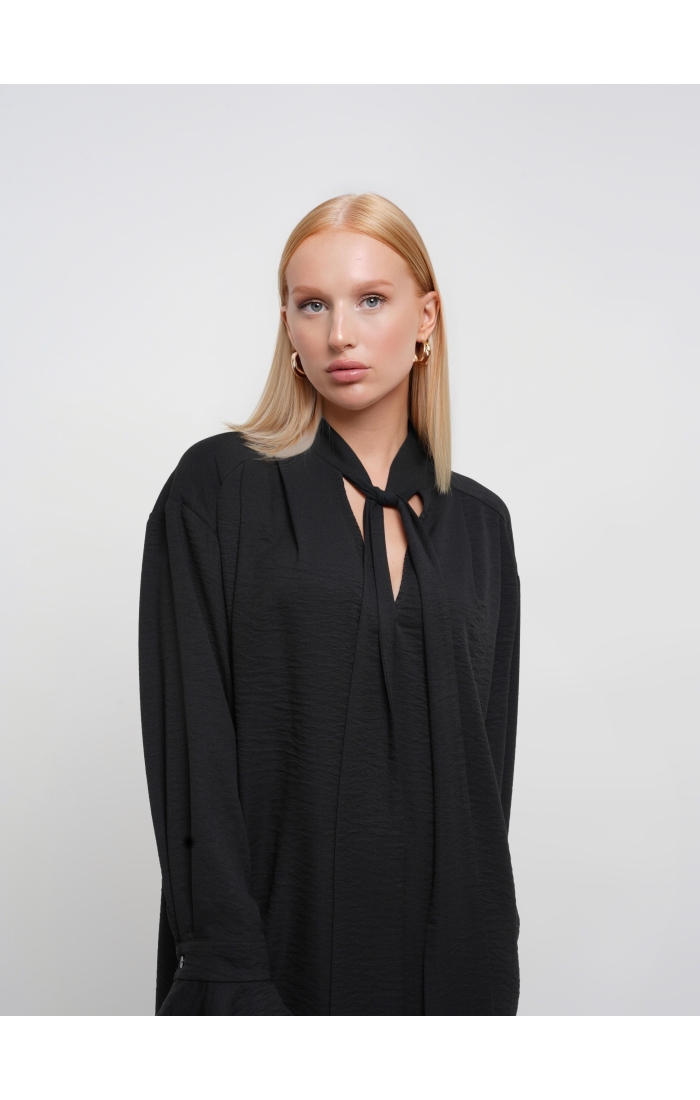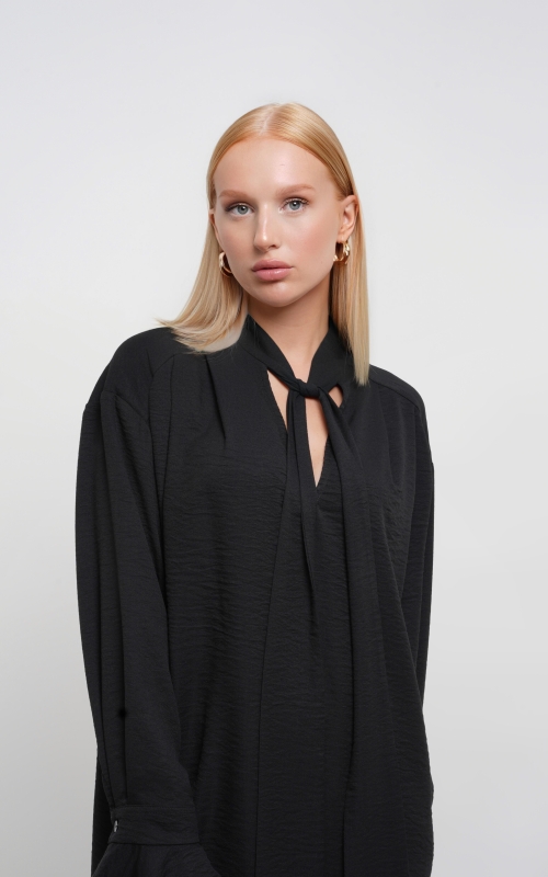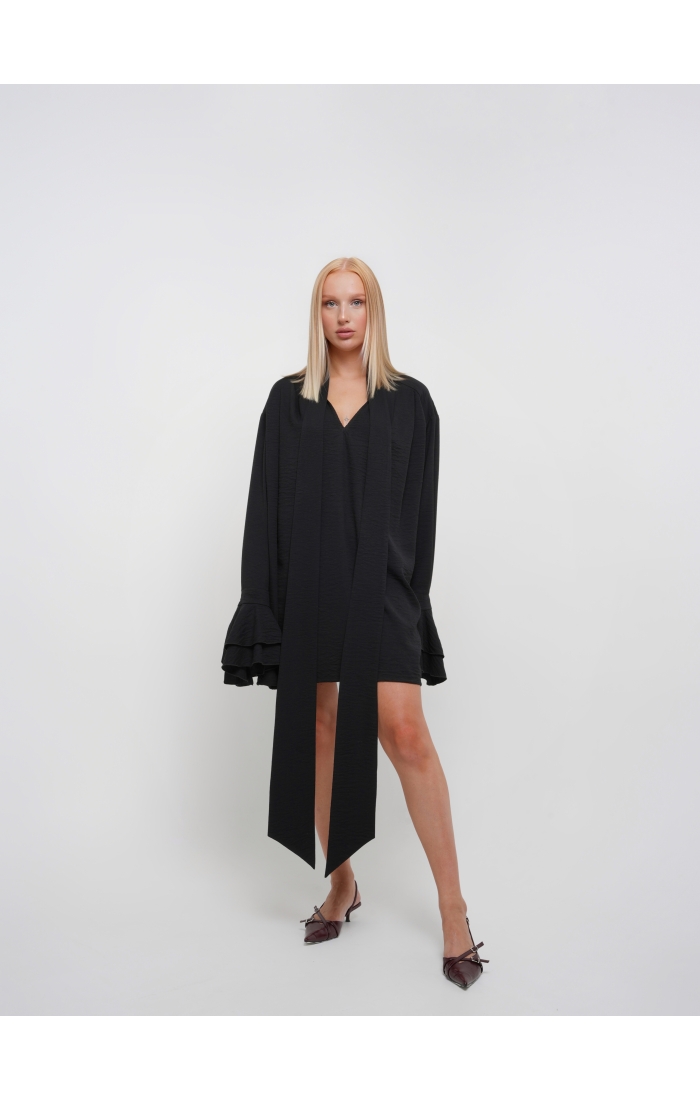 Платье свободного кроя в длине мини из "мятой" вискозы. Отличительными деталями являются длинные ленты, которые можно завязывать в бант или галстук. Также по бокам у платья расположена планка с расстегивающимися пуговицами, с помощью которых можно регулировать высоту разреза. В комплекте есть шнурок, которым можно приталить платье.
