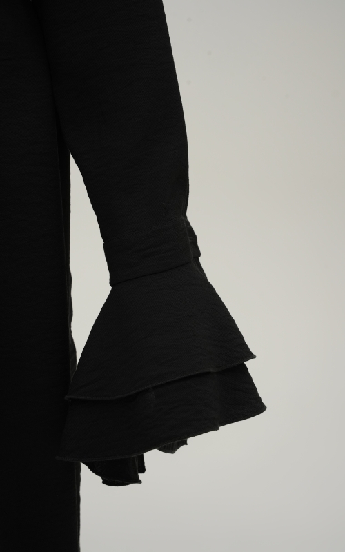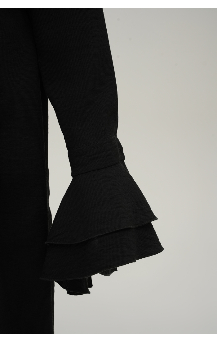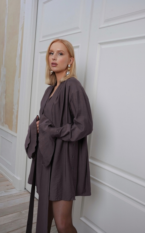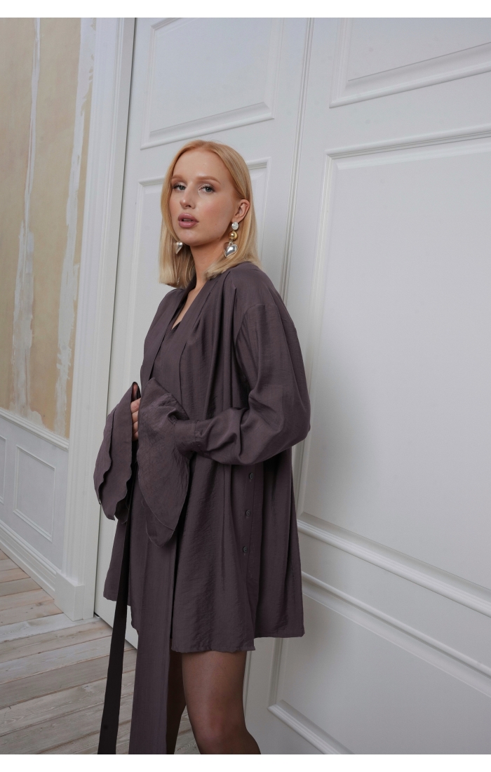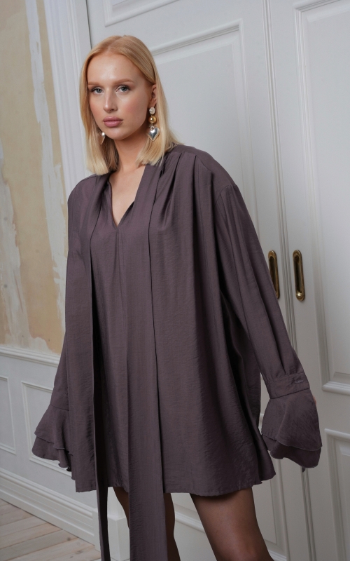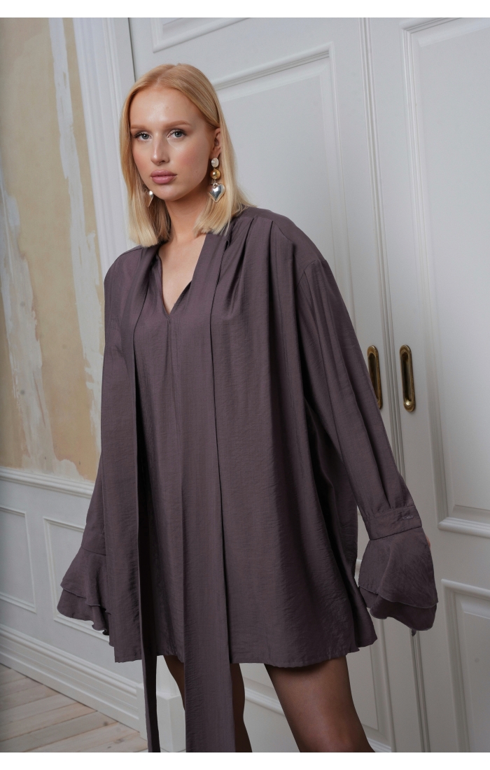 Платье свободного кроя в длине мини из "мятой" вискозы. Отличительными деталями являются длинные ленты, которые можно завязывать в бант или галстук. Также по бокам у платья расположена планка с расстегивающимися пуговицами, с помощью которых можно регулировать высоту разреза. В комплекте есть шнурок, которым можно приталить платье.