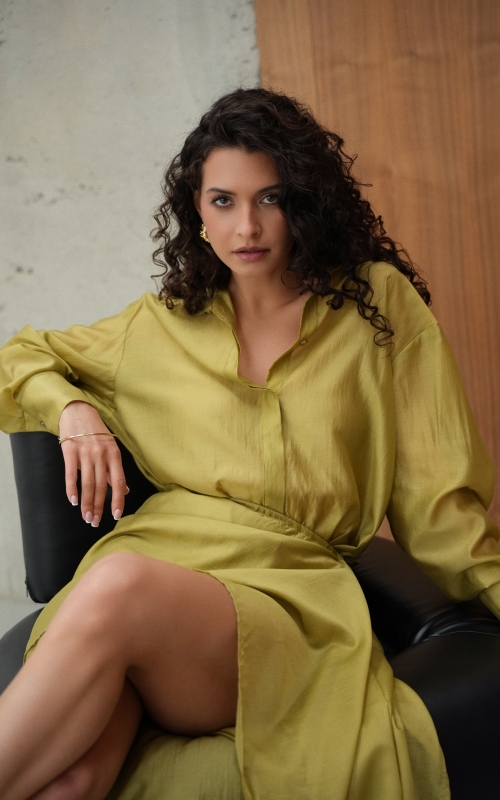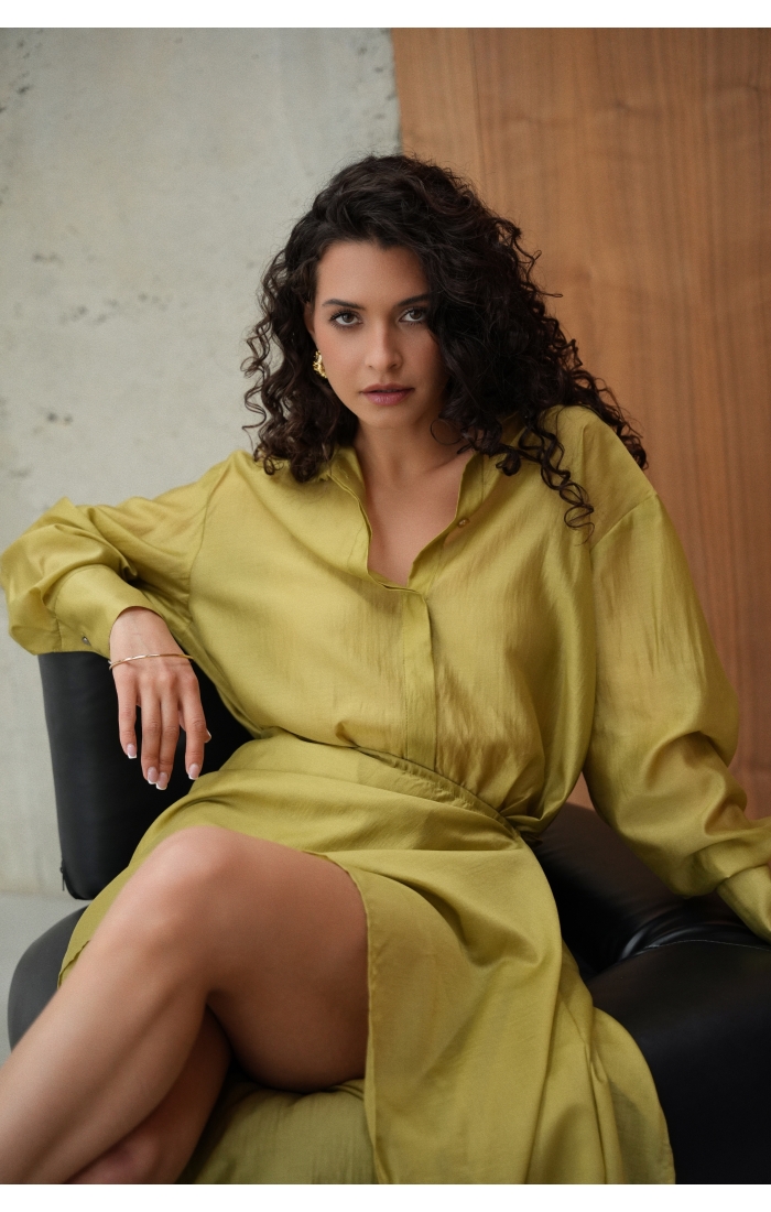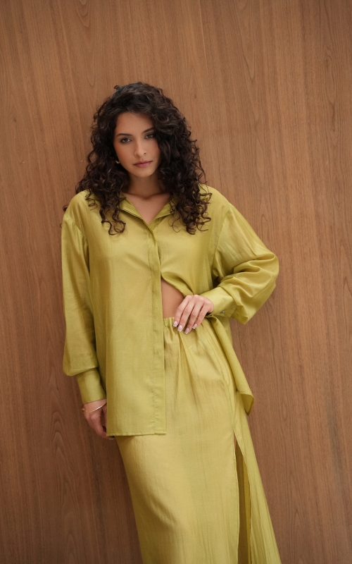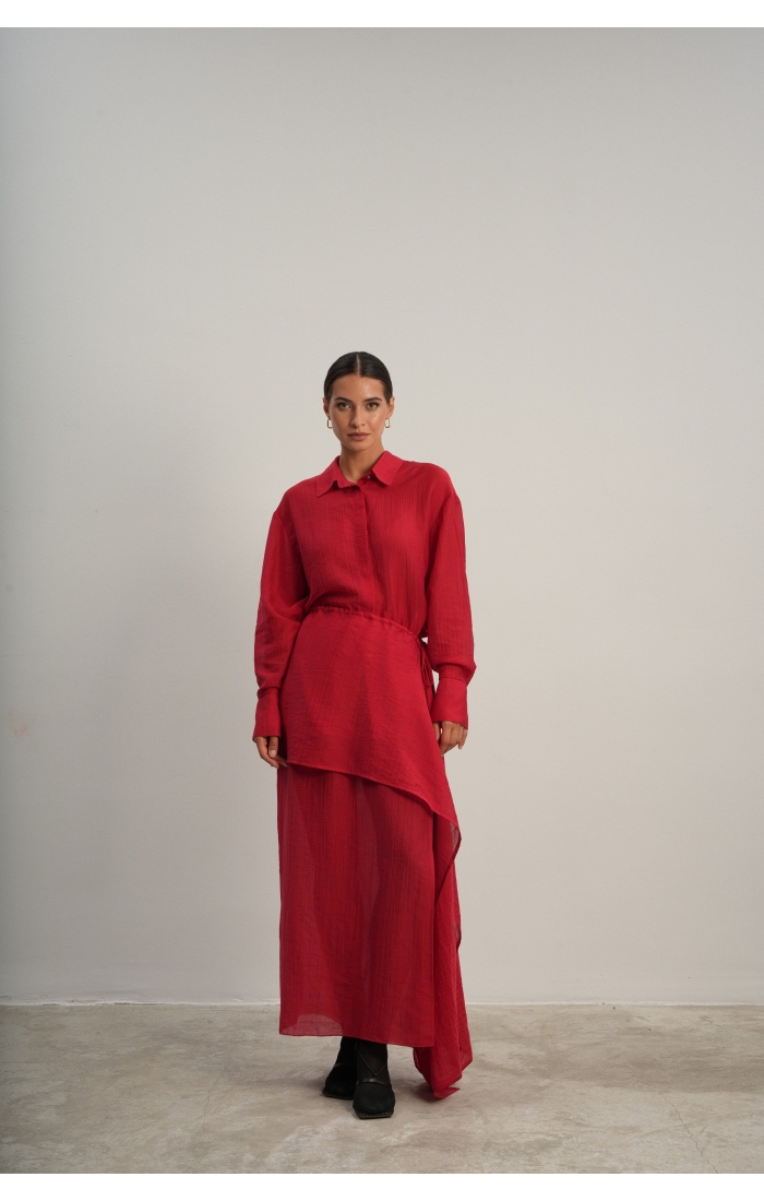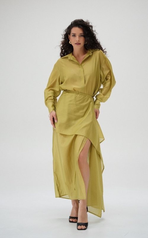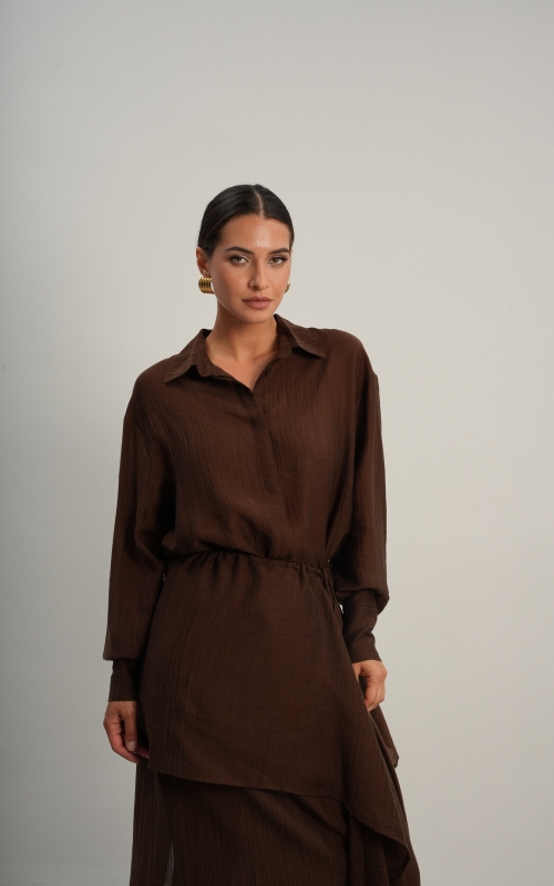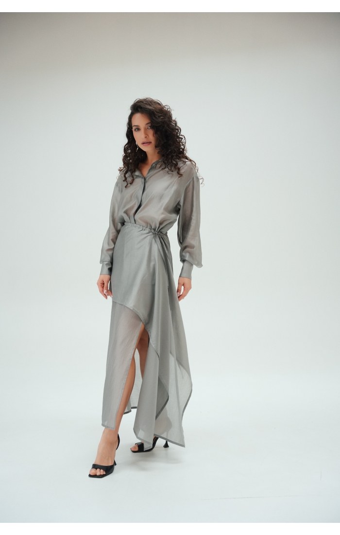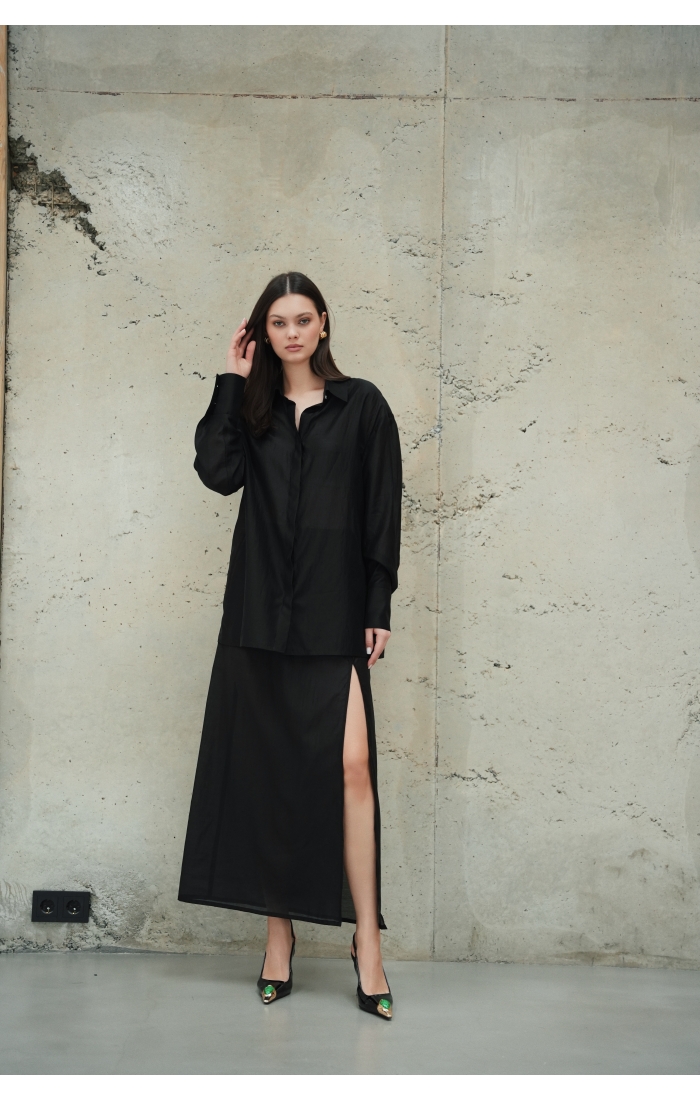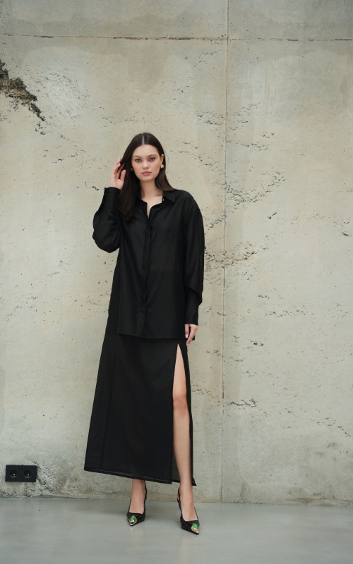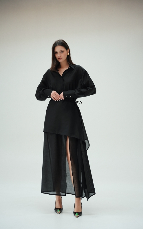 Рубашка прямого кроя со скрытой планкой. Акцентные металлические пуговицы на вороте и манжетах. Рубашка имеет выверенную длину, которая перекрывает паховую зону. Поэтому её можно носить с нижней юбкой без баски, заправляя рубашку или оставляя поверх юбки.
